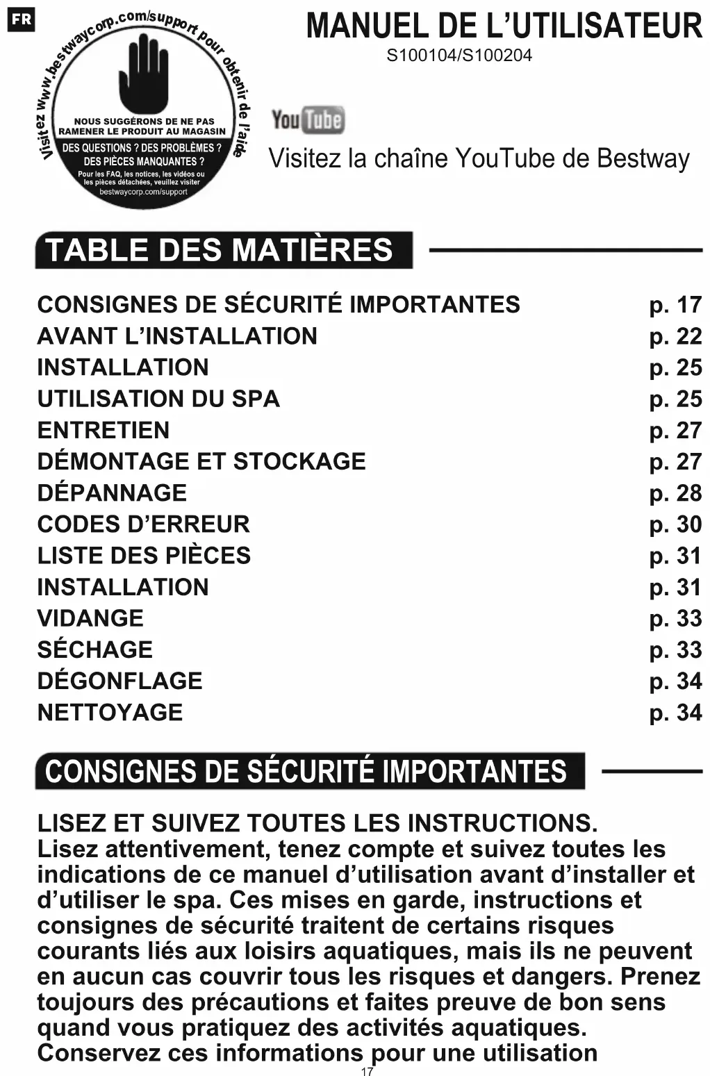 NOUS SUGGÉRONS DE NE PASRAMENER LE PRODUIT AU MAGASINDES QUESTIONS ? DES PROBLÈMES ?DES PIÈCES MANQUANTES ?Pour les FAQ, les notices, les vidéos oules pièces détachées, veuillez visiterbestwaycorp.com/support ultérieure. De plus, les informations suivantes peuvent être fournies en fonction du type de spa. Conservez ces instructions dans un endroit sûr. Si des instructions sont perdues, veuillez contacter le fabricant ou les rechercher sur le site www.bestwaycorp.com. 17LISEZ ET SUIVEZ TOUTES LES INSTRUCTIONS. Lisez attentivement, tenez compte et suivez toutes les indications de ce manuel d’utilisation avant d’installer et d’utiliser le spa. Ces mises en garde, instructions et consignes de sécurité traitent de certains risques courants liés aux loisirs aquatiques, mais ils ne peuvent en aucun cas couvrir tous les risques et dangers. Prenez toujours des précautions et faites preuve de bon sens quand vous pratiquez des activités aquatiques. Conservez ces informations pour une utilisation ATTENTION