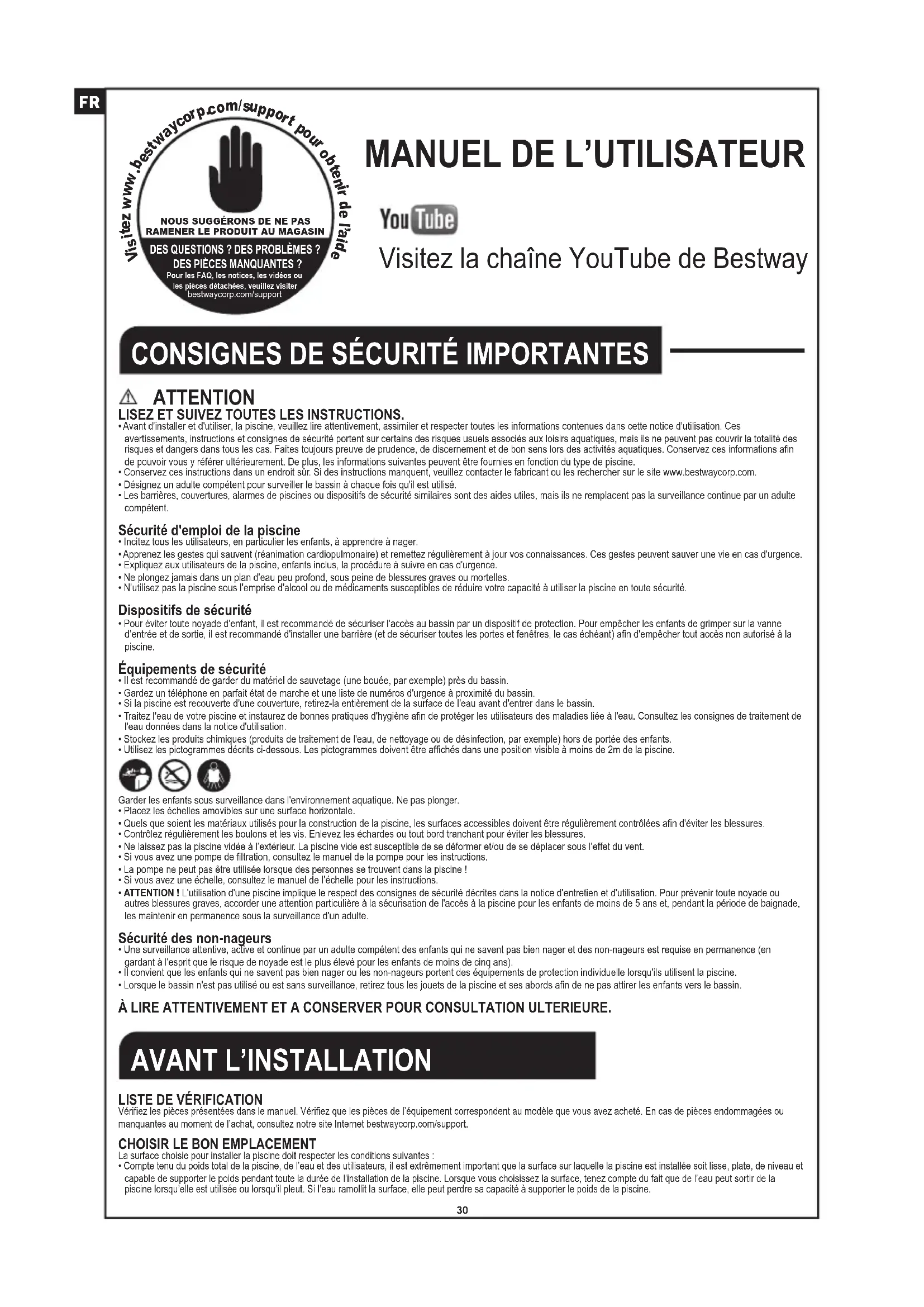 - Conservez ces instructions dans un endroit sûr. Si des instructions manquent, veuillez contacter le fabricant ou les rechercher sur le site www.bestwaycorp.com.