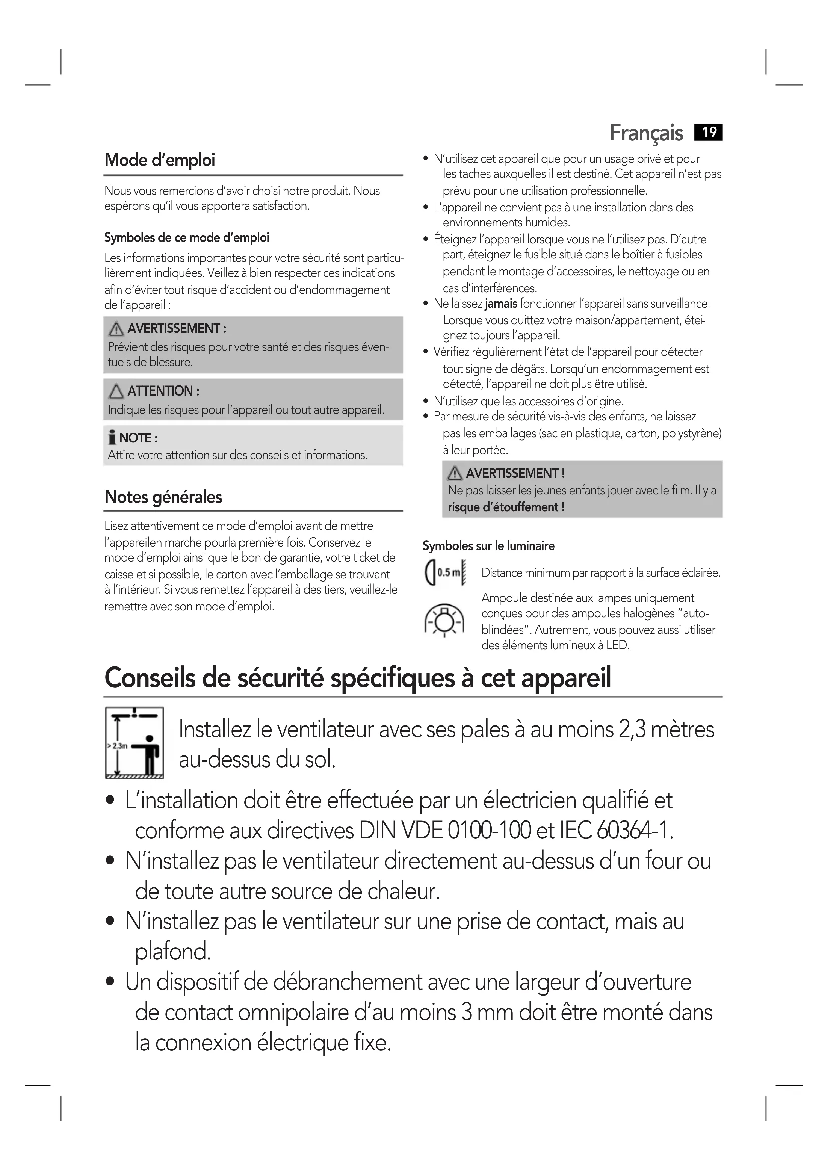 Mode d’emploi Nous vous remercions d’avoir choisi notre produit. Nous espérons qu’il vous apportera satisfaction.Symboles de ce mode d’emploiLes informations importantes pour votre sécurité sont particu lièrement indiquées. Veillez à bien respecter ces indications afin d’éviter tout risque d’accident ou d’endommagement de l’appareil : AVERTISSEMENT : Prévient des risques pour votre santé et des risques éven-tuels de blessure. ATTENTION : Indique les risques pour l’appareil ou tout autre appareil. NOTE : Attire votre attention sur des conseils et informations. Notes générales Lisez attentivement ce mode d’emploi avant de mettre l’appareilen marche pourla première fois. Conservez le mode d’emploi ainsi que le bon de garantie, votre ticket de caisse et si possible, le carton avec l’emballage se trouvant à l’intérieur. Si vous remettez l’appareil à des tiers, veuillez-le remettre avec son mode d’emploi.• N’utilisez cet appareil que pour un usage privé et pour les taches auxquelles il est destiné. Cet appareil n’est pas prévu pour une utilisation professionnelle.• L’appareil ne convient pas à une installation dans des environnements humides.• Éteignez l’appareil lorsque vous ne l’utilisez pas. D’autre part, éteignez le fusible situé dans le boîtier à fusibles pendant le montage d’accessoires, le nettoyage ou en cas d’interférences.• Ne laissez jamais fonctionner l’appareil sans surveillance. Lorsque vous quittez votre maison/appartement, étei gnez toujours l’appareil.• Vérifiez régulièrement l’état de l’appareil pour détecter tout signe de dégâts. Lorsqu’un endommagement est détecté, l’appareil ne doit plus être utilisé.• N’utilisez que les accessoires d’origine.• Par mesure de sécurité vis-à-vis des enfants, ne laissez pas les emballages (sac en plastique, carton, polystyrène) à leur portée. AVERTISSEMENT ! Ne pas laisser les jeunes enfants jouer avec le film. Il y a risque d’étouffement !Symboles sur le luminaireDistance minimum par rapport à la surface éclairée.Ampoule destinée aux lampes uniquement conçues pour des ampoules halogènes “auto-blindées”. Autrement, vous pouvez aussi utiliser des éléments lumineux à LED. Conseils de sécurité spécifiques à cet appareil Installez le ventilateur avec ses pales à au moins 2,3 mètres au-dessus du sol.