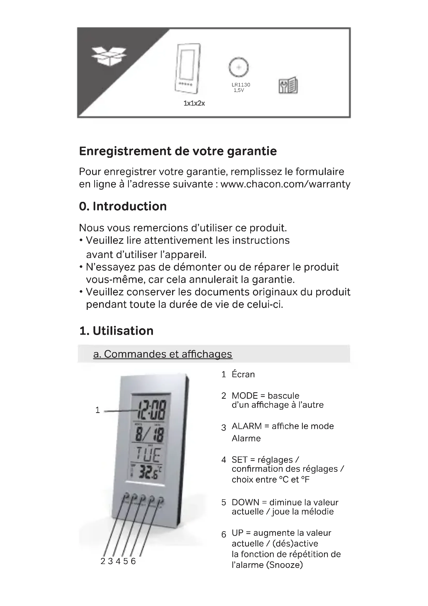 a. Commandes et achages Pour enregistrer votre garantie, remplissez le formulaire en ligne à l’adresse suivante: www.chacon.com/warranty Nous vous remercions d’utiliser ce produit.