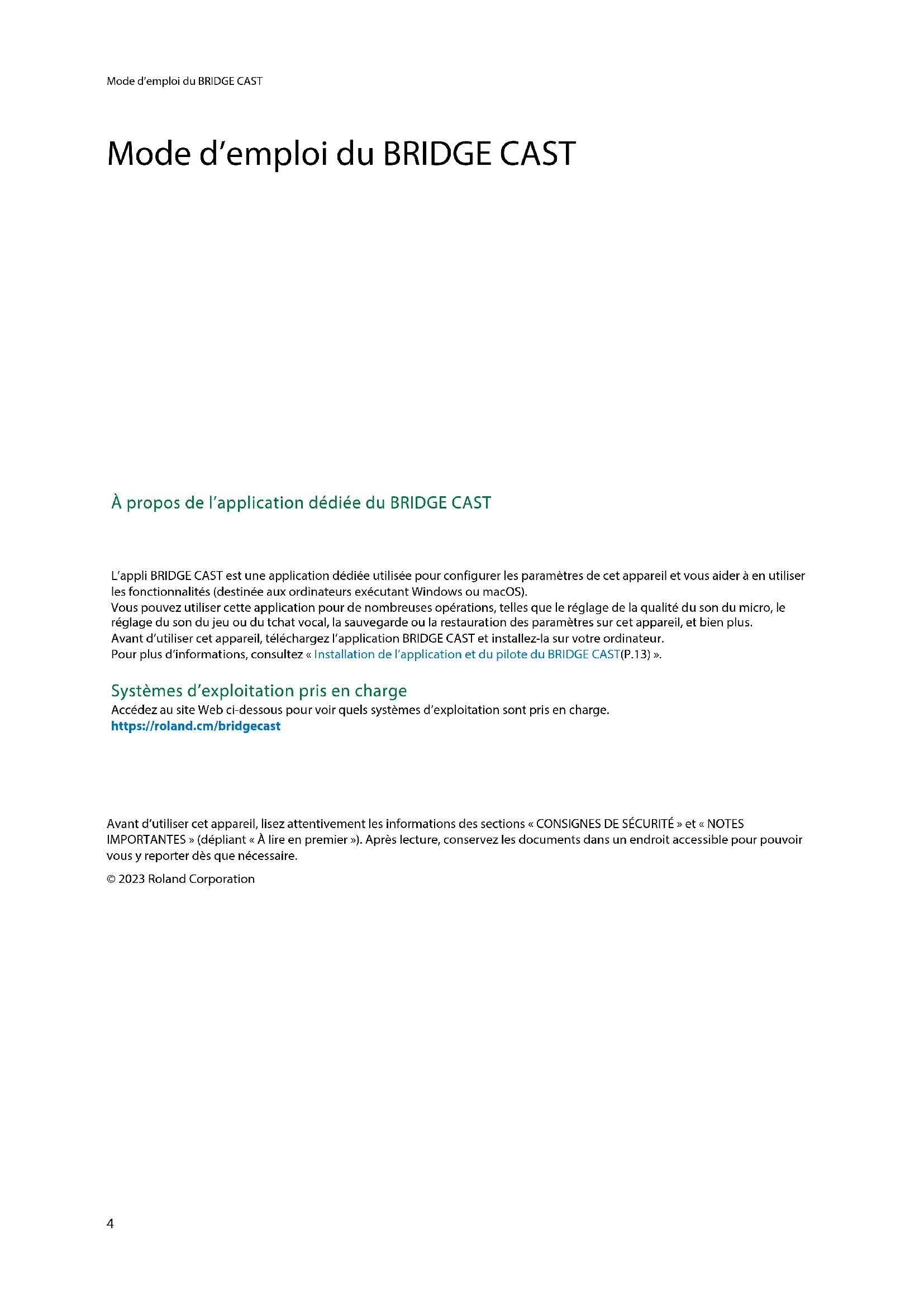 À propos de l’application dédiée du BRIDGE CAST L’appli BRIDGE CAST est une application dédiée utilisée pour configurer les paramètres de cet appareil et vous aider à en utiliser les fonctionnalités (destinée aux ordinateurs exécutant Windows ou macOS). Vous pouvez utiliser cette application pour de nombreuses opérations, telles que le réglage de la qualité du son du micro, le réglage du son du jeu ou du tchat vocal, la sauvegarde ou la restauration des paramètres sur cet appareil, et bien plus. Avant d’utiliser cet appareil, téléchargez l’application BRIDGE CAST et installez-la sur votre ordinateur. Pour plus d’informations, consultez « Installation de l’application et du pilote du BRIDGE CAST(P.13) ». Systèmes d’exploitation pris en charge Accédez au site Web ci-dessous pour voir quels systèmes d’exploitation sont pris en charge. https://roland.cm/bridgecast