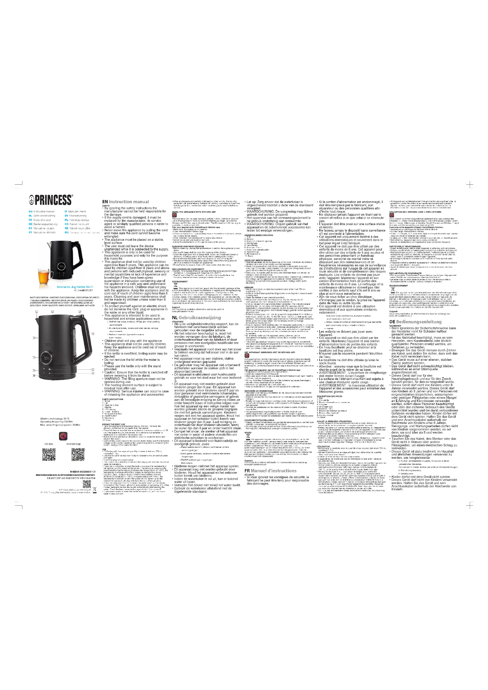 - AVERTISSEMENT: la mauvaise utilisation de l'appareil et des accessoires peut entraîner des blessures graves. DESCRIPTION DES PIÈCES1. Bec2. Couvercle3. Bouton d'ouverture du couvercle4. Poignée5. Affichage LED6. Boutons + et –7. Bouton de maintien au chaud8. Bouton Marche/Arrêt9. Corps principal10. BaseAVANT LA PREMIÈRE UTILISATION• Sortez l'appareil et les accessoires hors de la boîte.Retirez lesautocollants, le film protecteur ou le plastique de l'appareil.• Mettez l'appareil sur une surface stable plate et assurez un dégagementtout autour de l'appareil d'au moins 10 cm. Cet appareil ne convient pasà une installation dans une armoire ou à un usage à l'extérieur.• Faites bouillir une bouilloire d’eau avant la première utilisation pournettoyer la bouilloire et jetez cette eau.• Mettez le câble d'alimentation dans la prise. (Remarque : Assurez-vousque la tension indiquée sur l'appareil correspond à la tension localeavant de brancher l'appareil. Voltage : 220 V-240 V 50-60 Hz).UTILISATION• Remplissez la bouilloire avec la quantité d'eau requise (minimum 750ml,maximum 1,7L).• Utilisez l'indicateur sur le corps principal pour déterminer la quantitéd'eau dont vous avez besoin.• Insérez la fiche secteur dans la prise murale.• L'appareil est en mode standby et l'affichage indique la températureactuelle de l'eau.• Appuyez sur le bouton Marche/Arrêt pour mettre en marche l'appareil. Letémoin s'allume et l'eau commence à bouillir. L'appareil s'éteintautomatiquement lorsque l'affichage indique la température de100°C.Le témoin lumineux s'éteint et le buzzer émet trois bips.• Utilisez les boutons + et – pour régler la température souhaitée(choisissez 40, 50, 60, 70, 80, 90, 95 ou 100°C) et appuyez sur lebouton Marche/Arrêt; le témoin lumineux s'allume et l'eau est chauffé àla température désirée. L'écran affiche la température actuelle de l'eau.• Appuyez sur le bouton de maintien au chaud pour maintenir l'eau à latempérature choisie pendant 2heures. Lorsque la température descenden dessous de 3°C par rapport à la température souhaitée, l'appareilcommence automatiquement à réchauffer l'eau. Appuyez de nouveausur le bouton de maintien au chaud pour quitter ce mode.• S’il n’y a pas suffisamment d’eau, la bouilloire s’éteindra, s’il y en a trop,l’eau débordera.• Si l'appareil est accidentellement mis en marche alors qu'il est vide, laprotection contre l'ébullition à sec se déclenche automatiquement.Ajoutez de l'eau pour refroidir le mécanisme de protection contrel'ébullition à sec afin de pouvoir utiliser la bouilloire normalement.UTILISATION DE L'APPAREIL AVEC L'APPLI KITCHENVous pouvez contrôler l'appareil manuellement avec ses commandesintégrées ou utiliser votre smartphone ou des commandes vocales. Avantde commencer, téléchargez et installez l'appli Homewizard Kitchen. L’appliHomewizard Kitchen existe pour Android et iOS.Associez votre appareil à l'appli HomeWizard Kitchen.• Assurez-vous que l'appareil est branché et allumé.• Ouvrez l'appli HomeWizard Kitchen.• Créez un compte, ou si vous avez déjà un compte HomeWizard, veuillezvous connecter à l'aide de ces détails.• Cliquez sur «Add new Kitchen Device» pour ajouter un nouvel appareil.• Sélectionnez l'appareil que vous voulez connecter.• Suivez les instructions sur l'application pour connecter l'appareil.NETTOYAGE ET MAINTENANCE• Avant le nettoyage, débranchez l'appareil et attendez qu'il refroidisse.• Utilisez un chiffon doux humide pour nettoyer les surfaces de l’appareil.• Nettoyez l'appareil avec un chiffon humide. N'utilisez pas de produitsnettoyants agressifs ou abrasifs, de tampons à récurer ou de laine deverre, ceux-ci pourraient endommager l'appareil.• N’immergez jamais la bouilloire et le socle dans l’eau ou tout autreliquide.• L'appareil doit être détartré régulièrement. Utilisez un détartrant adaptéaux appareils électroménagers.• Après le détartrage, rincez plusieurs fois la bouilloire avec de l’eaupropre.DÉCLARATION DE CONFORMITÉ• Par la présente, Smartwares Europe déclare que le type d'équipementradio236060 est conforme à la Directive 2014/53/UE• Le texte intégral de la déclaration de conformité est disponible àl'adresse internet suivante: www.princesshome.eu/docENVIRONNEMENTCet appareil ne doit pas être jeté avec les déchets ménagers à lafin de sa durée de vie, il doit être remis à un centre de recyclage pour lesappareils électriques et électroniques. Ce symbole sur l'appareil, lemanuel d'utilisation et l'emballage attire votre attention sur un pointimportant. Les matériaux utilisés dans cet appareil sont recyclables. Enrecyclant vos appareils, vous contribuez de manière significative à laprotection de notre environnement. Renseignez-vous auprès des autoritéslocales pour connaître les centres de collecte des déchets.SupportVous retrouvez toutes les informations et pièces de rechange surwww.princesshome.eu! DEBedienungsanleitung SICHERHEIT
