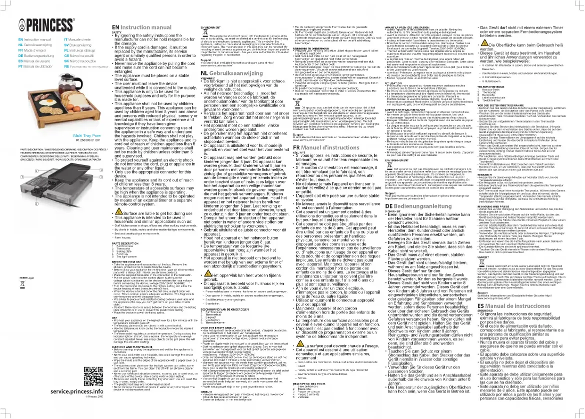 - N'immergez jamais l'appareil dans l'eau ni aucun autre liquide. L'appareil ne peut pas être nettoyé en lave-vaisselle. ENVIRONNEMENT Cet appareil ne doit pas être jeté avec les déchets ménagers à la fin de sa durée de vie, il doit être remis à un centre de recyclage pour les appareils électriques et électroniques. Ce symbole sur l'appareil, le manuel d'utilisation et l'emballage attire votre attention sur un point important. Les matériaux utilisés dans cet appareil sont recyclables. En recyclant vos appareils, vous contribuez de manière significative à la protection de notre environnement. Renseignez-vous auprès des autorités locales pour connaître les centres de collecte des déchets. Support Vous pouvez trouver toutes les informations et pièces de rechange sur http://www.service.princess.info/! DEBedienungsanleitung SICHERHEIT