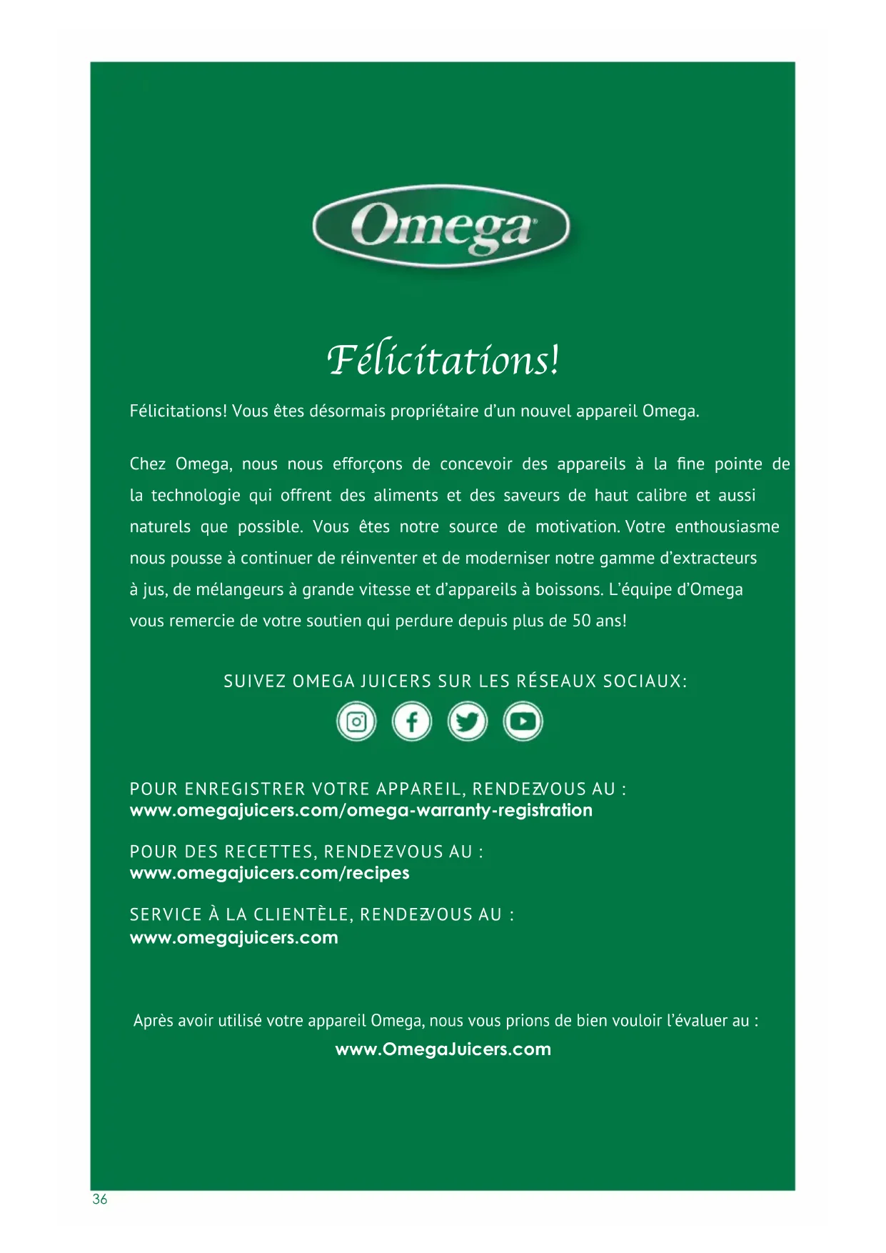 SUIVEZ OMEGA JUICERS SUR LES RÉSEAUX SOCIAUX: Félicitations! Félicitations! Vous êtes désormais propriétaire d’un nouvel appareil Omega. Chez Omega, nous nous efforçons de concevoir des appareils à la ne pointe de la technologie qui offrent des aliments et des saveurs de haut calibre et aussi naturels que possible. Vous êtes notre source de motivation. Votre enthousiasme nous pousse à continuer de réinventer et de moderniser notre gamme d’extracteurs à jus, de mélangeurs à grande vitesse et d’appareils à boissons. L’équipe d’Omega vous remercie de votre soutien qui perdure depuis plus de 50 ans!