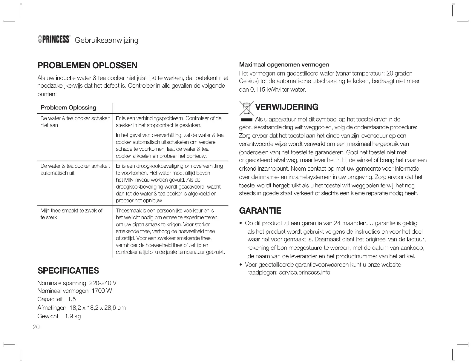 - La carafe va au lave-vaisselle. Mettez-la à l'envers au lave-vaisselle. Placez le couvercle séparément dans le lave-vaisselle afin de détartrer le bec verseur à filtre. Nettoyage au la lave-vaisselle La carafe va au lave-vaisselle. Mettez-la à l'envers au lave-vaisselle. Placez le couvercle séparément dans le lave-vaisselle afin de détartrer le bec verseur à filtre. Nettoyage à la main (l’image 9.) Vous pouvez facilement nettoyer à la main la carafe en verre. Enlevez tout le couvercle afin d'atteindre toute la partie intérieure de la carafe. Rangement Vérifiez que le socle est éteint, propre et sec avant de le ranger. Vérifiez que le couvercle est fermé et bien verrouillé. Posez la carafe debout sur le socle d'alimentation. Ne rangez rien par-dessus. DÉPANNAGE Si votre appareil à induction présente des dysfonctionnements, il ne s'agit pas forcément d'une défaillance. Dans tous les cas, vérifiez les points suivants : Problème Solution La water & tea cooker ne s'allume pas. Il y a un problème de connexion. Vérifiez si la fiche est branchée sur la prise murale. En cas de surchauffe, la théière s'éteindra automatiquement afin de prévenir d’autres dommages, laissez la théière refroidir et réessayez. La water & tea cooker s'éteint automatiquement. C'est à cause d'une sécurité thermique en cas de fonctionnement à sec. La théière doit toujours être remplie d’eau au-dessus du niveau MIN. Si la sécurité thermique s‘active, attendez que la water & tea cooker refroidisse et réessayez. Le goût de mon thé est trop léger ou trop fort. Le goût du thé est une question de goût personnel et peut nécessiter des essais pour obtenir le goût que vous préférez. Pour obtenir un thé plus fort, augmentez la quantité de thé ou la durée d'infusion. Pour obtenir un thé moins fort, diminuez la quantité de thé ou la durée d'infusion et vérifiez toujours que vous utilisez la bonne température. Mode d’emploi29 CARACTÉRISTIQUES Tension nominale : 220-240 V Puissance nominale de sortie : 1700 W Capacité : 1,5 L Dimensions : 18,2 x 18,2 x 28,6 cm Poids : 1,9 kg Consommation électrique maximale La puissance pour chauffer de l'eau distillée (température de démarrage : 20°C) jusqu'à l'arrêt automatique ne doit pas dépasser 0,115 kWh/litre d'eau.