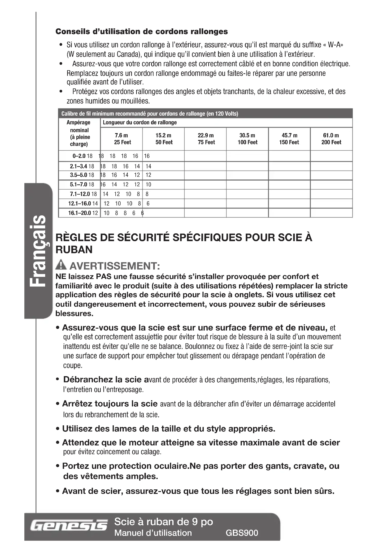 Français Scie à ruban de 9 po Manuel d’utilisation GBS900 Conseils d’utilisation de cordons rallonges