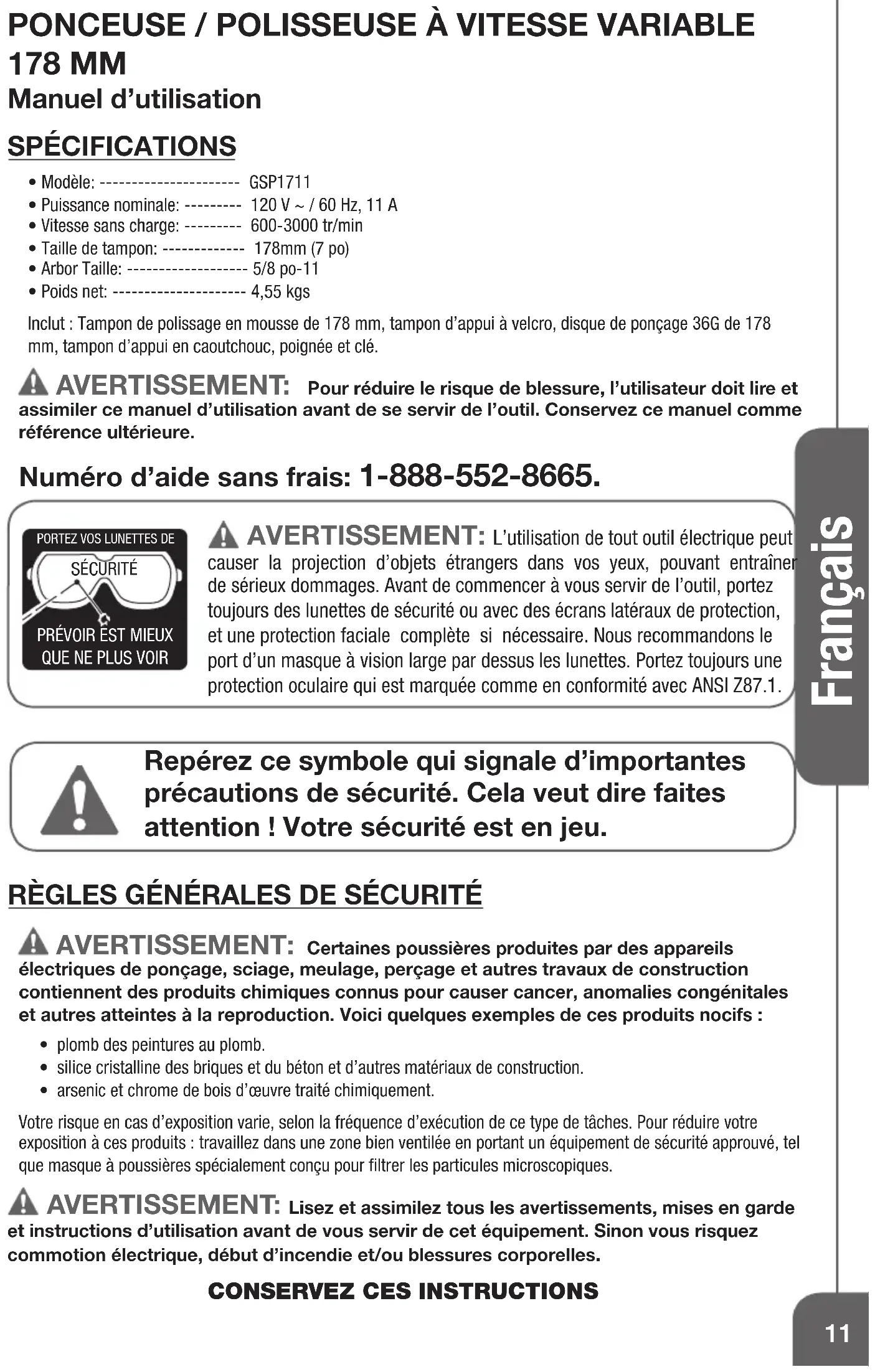 et instructions d’utilisation avant de vous servir de cet équipement. Sinon vous risquez commotion électrique, début d’incendie et/ou blessures corporelles. CONSERVEZ CES INSTRUCTIONSFrançais Ponceuse / polisseuse à vitesse variable 178 mm Manuel d’utilisation GSP1711