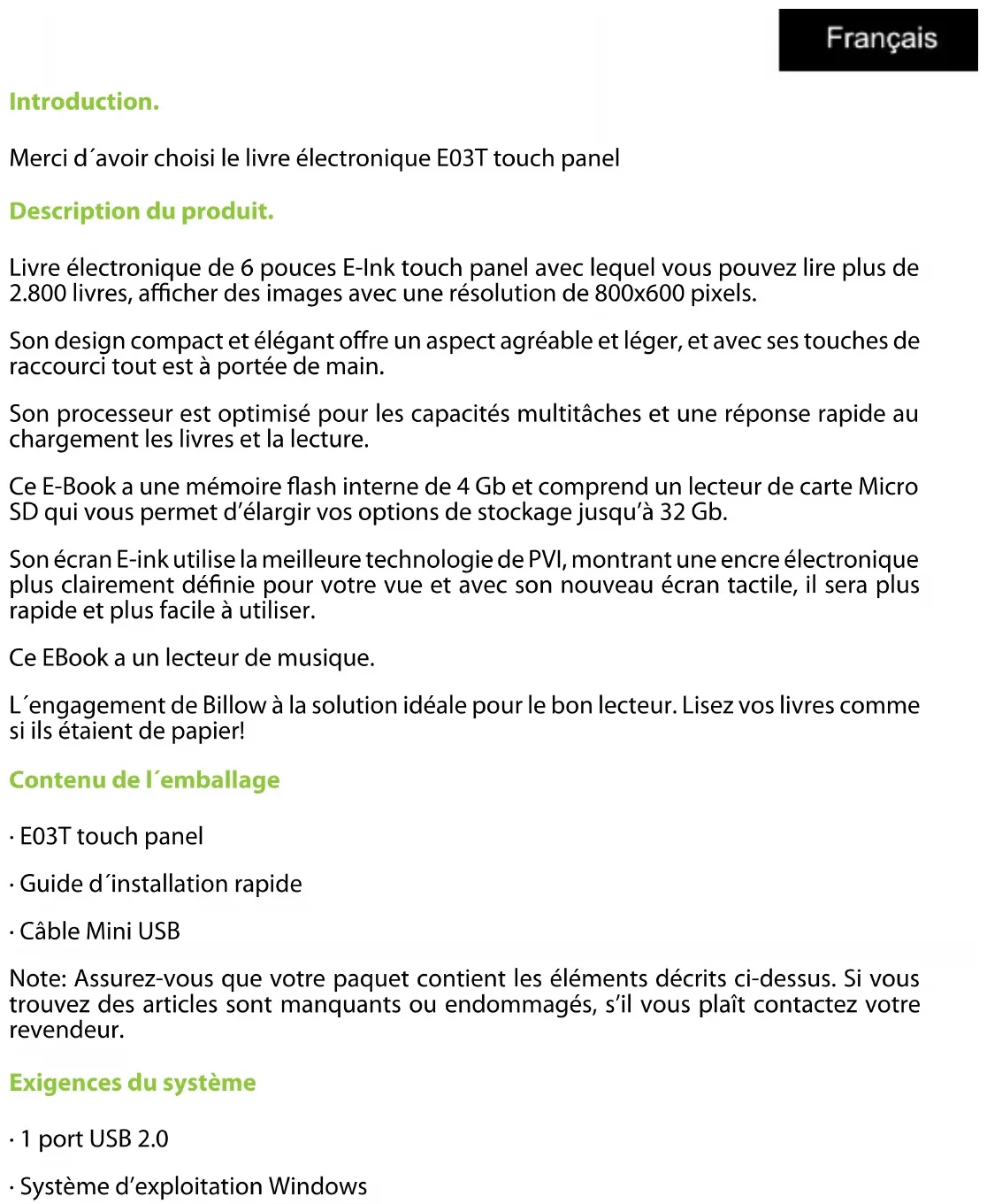 E03T - Lecteur électronique Billow - Notice d'utilisation et mode d'emploi gratuit