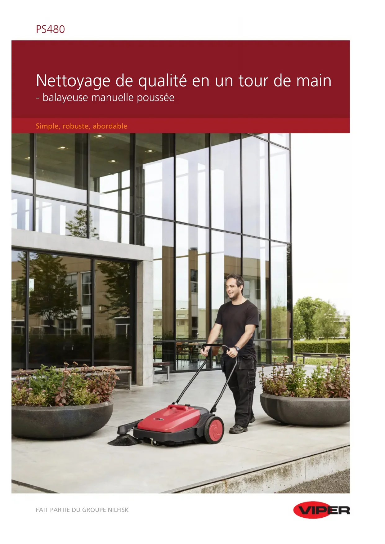 | Caractéristiques techniques | Balayeuse Viper PS480, moteur électrique, largeur de travail 480 mm, capacité du réservoir 50 L, poids 80 kg |