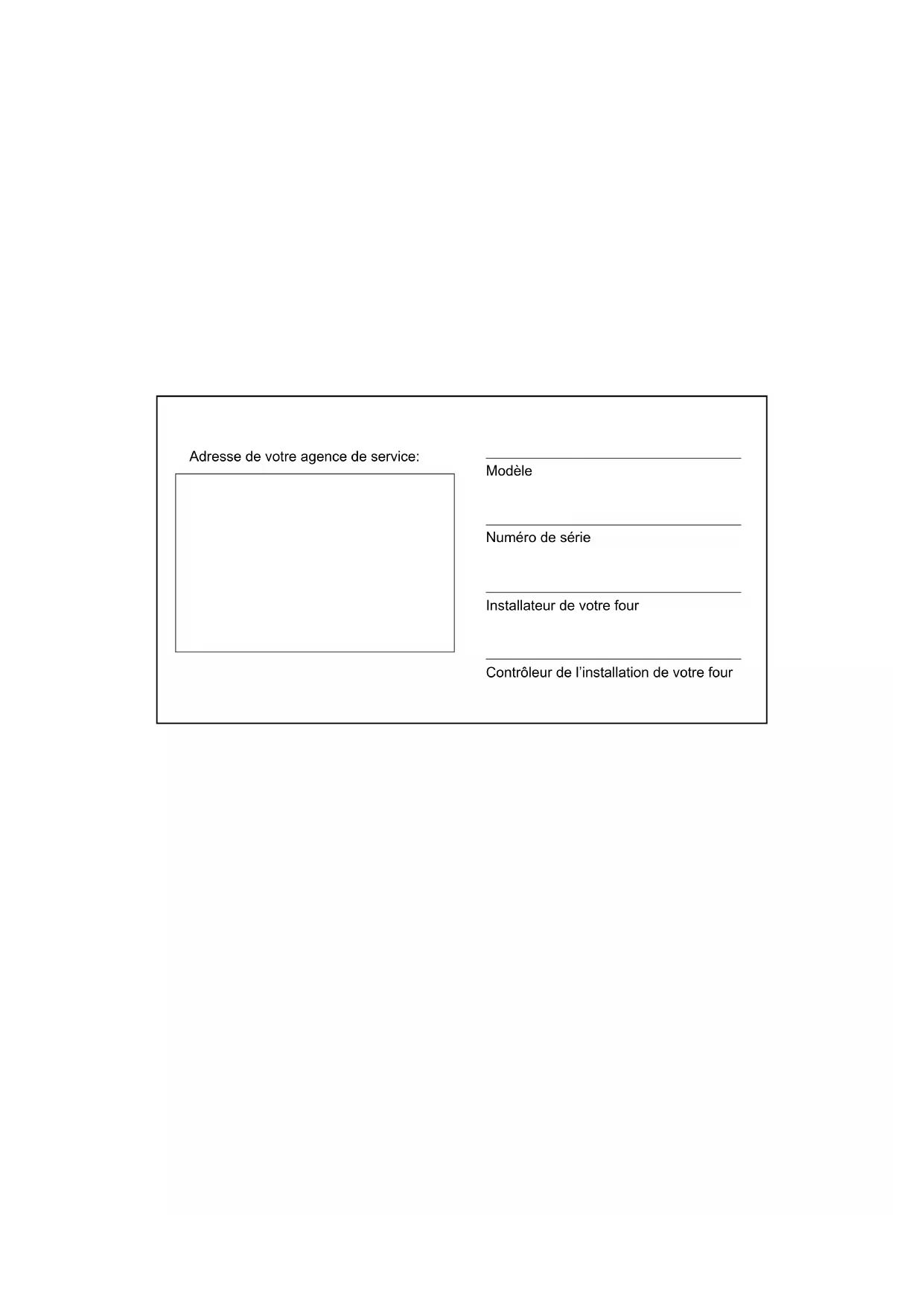 ENDROIT BIEN VISIBLE. Vous pouves vous les procerer au- près de votre fournissear de gaz local. AVERTISSEMENT Ne pas entreposer ni utiliser de l’essence ni d’autres vapeurs ou liquides inammables dans le voisinage de cet appariel, ni de tout autre appareil. Les informations données dans le présent manuel sont impor- tantes pour installer, utiliser et entretenir correctement ce four. Le respect de ces instructions et procédures permettra d’obtenir de bons résultats de cuisson et une longue durée de service sans problèmes. Veuillez lire le présent manuel et le conserver pour pouvoir vous y reporter à l’avenir. ERREURS: Les erreurs de de- scription, de typographie ou d’illustration font l’objet de corrections. Les caractéris- tiques sont sujettes à modi- cations sans préavis.