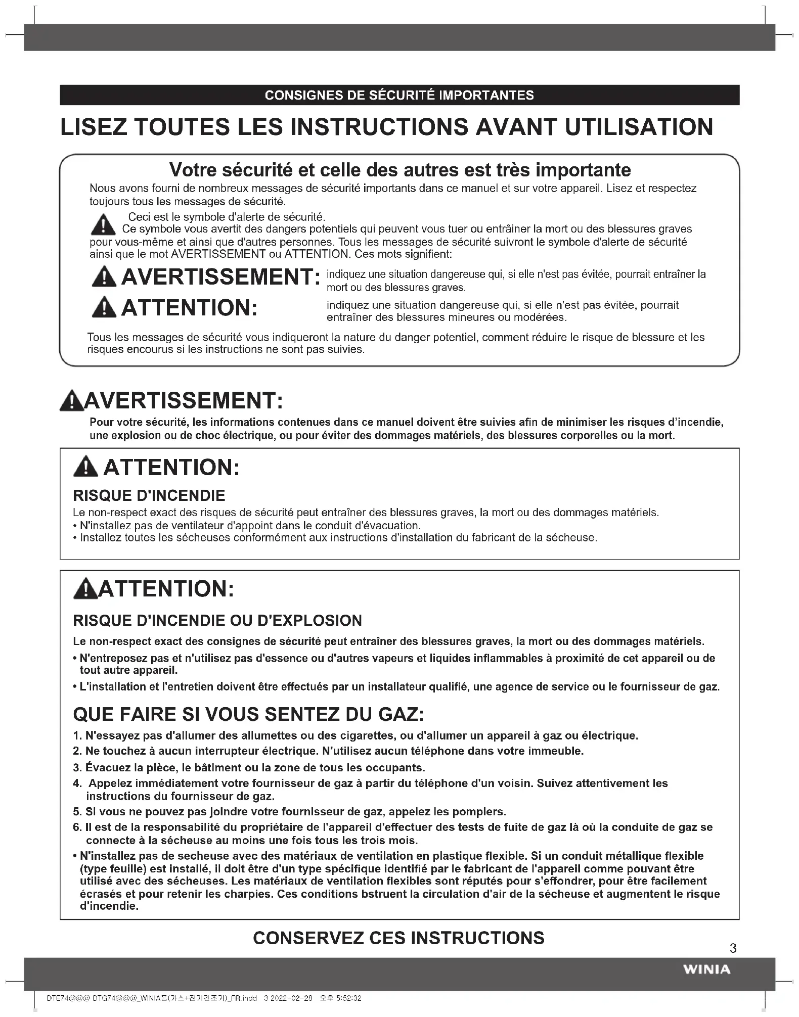 indiquez une situation dangereuse qui, si elle n'est pas évitée, pourrait entraîner la mort ou des blessures graves. ATTENTION: indiquez une situation dangereuse qui, si elle n'est pas évitée, pourrait entraîner des blessures mineures ou modérées. Tous les messages de sécurité vous indiqueront la nature du danger potentiel, comment réduire le risque de blessure et les risques encourus si les instructions ne sont pas suivies.DTE74@@@ DTG74@@@_WINIA폼(가스+전기건조기)_FR.indd 3 2022-02-28 오후 5:52:324 PRÉCAUTIONS DE SÉCURITÉ DE BASE