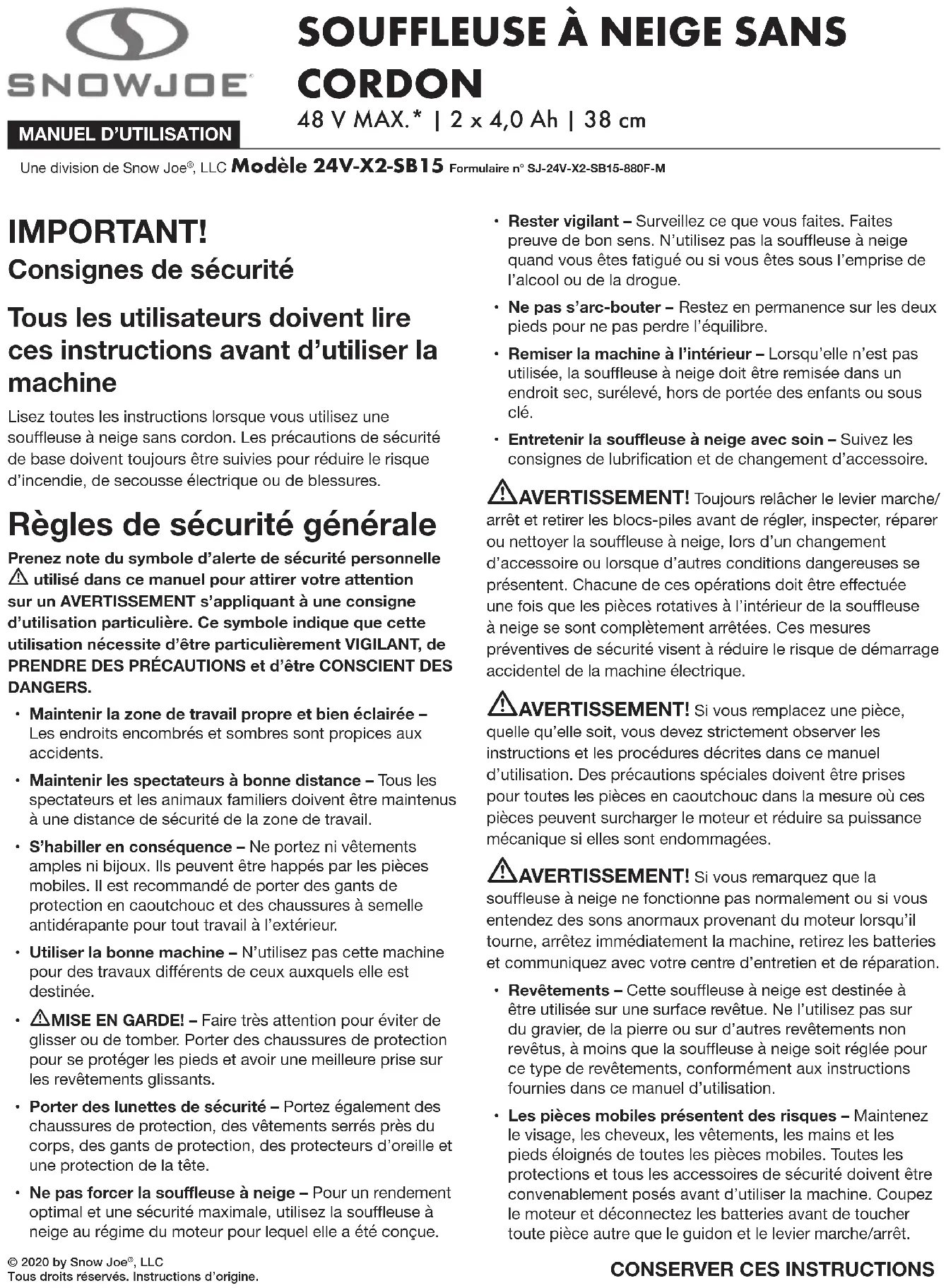 © 2020 by Snow Joe , LLCTous droits réservés. Instructions d’origine.