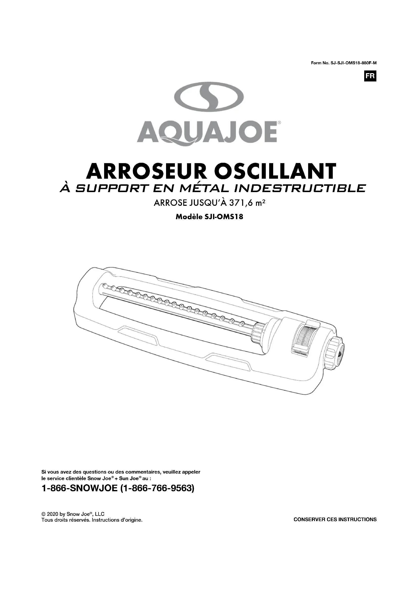 8FR Si vous avez des questions ou des commentaires, veuillez appelerle service clientèle Snow Joe + Sun Joe au : 1-866-SNOWJOE (1-866-766-9563) © 2020 by Snow Joe , LLCTous droits réservés. Instructions d’origine.CONSERVER CES INSTRUCTIONSForm No. SJ-SJI-OMS18-880F-M ARROSEUR OSCILLANT