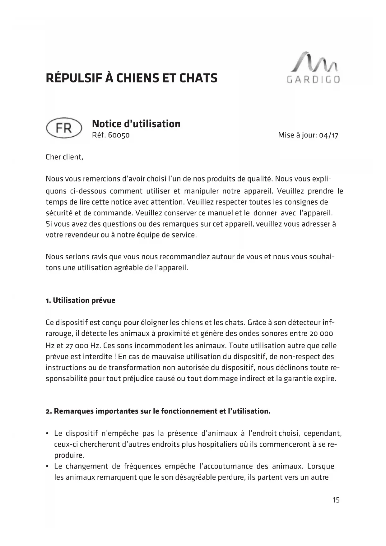 Ce dispositif est conçu pour éloigner les chiens et les chats. Grâce à son détecteur inf- rarouge, il détecte les animaux à proximité et génère des ondes sonores entre 20 000 Hz et 27 000 Hz. Ces sons incommodent les animaux. Toute utilisation autre que celle prévue est interdite ! En cas de mauvaise utilisation du dispositif, de non-respect des instructions ou de transformation non autorisée du dispositif, nous déclinons toute re- sponsabilité pour tout préjudice causé ou tout dommage indirect et la garantie expire.