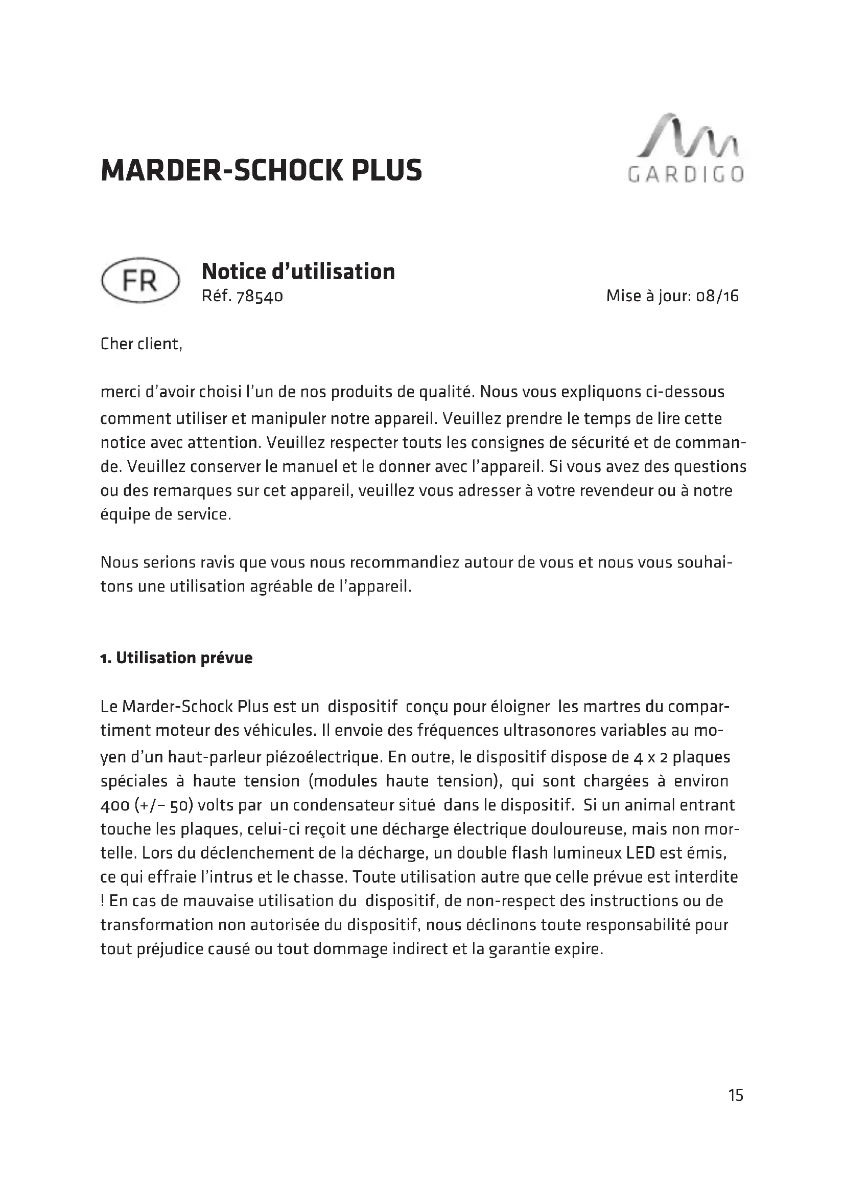Le Marder-Schock Plus est un dispositif conçu pour éloigner les martres du compar- timent moteur des véhicules. Il envoie des fréquences ultrasonores variables au mo- yen d’un haut-parleur piézoélectrique. En outre, le dispositif dispose de 4 x 2 plaques spéciales à haute tension (modules haute tension), qui sont chargées à environ 400 (+/– 50) volts par un condensateur situé dans le dispositif. Si un animal entrant touche les plaques, celui-ci reçoit une décharge électrique douloureuse, mais non mor- telle. Lors du déclenchement de la décharge, un double flash lumineux LED est émis, ce qui effraie l’intrus et le chasse. Toute utilisation autre que celle prévue est interdite ! En cas de mauvaise utilisation du dispositif, de non-respect des instructions ou de transformation non autorisée du dispositif, nous déclinons toute responsabilité pour tout préjudice causé ou tout dommage indirect et la garantie expire. Mise à jour: 08/1616