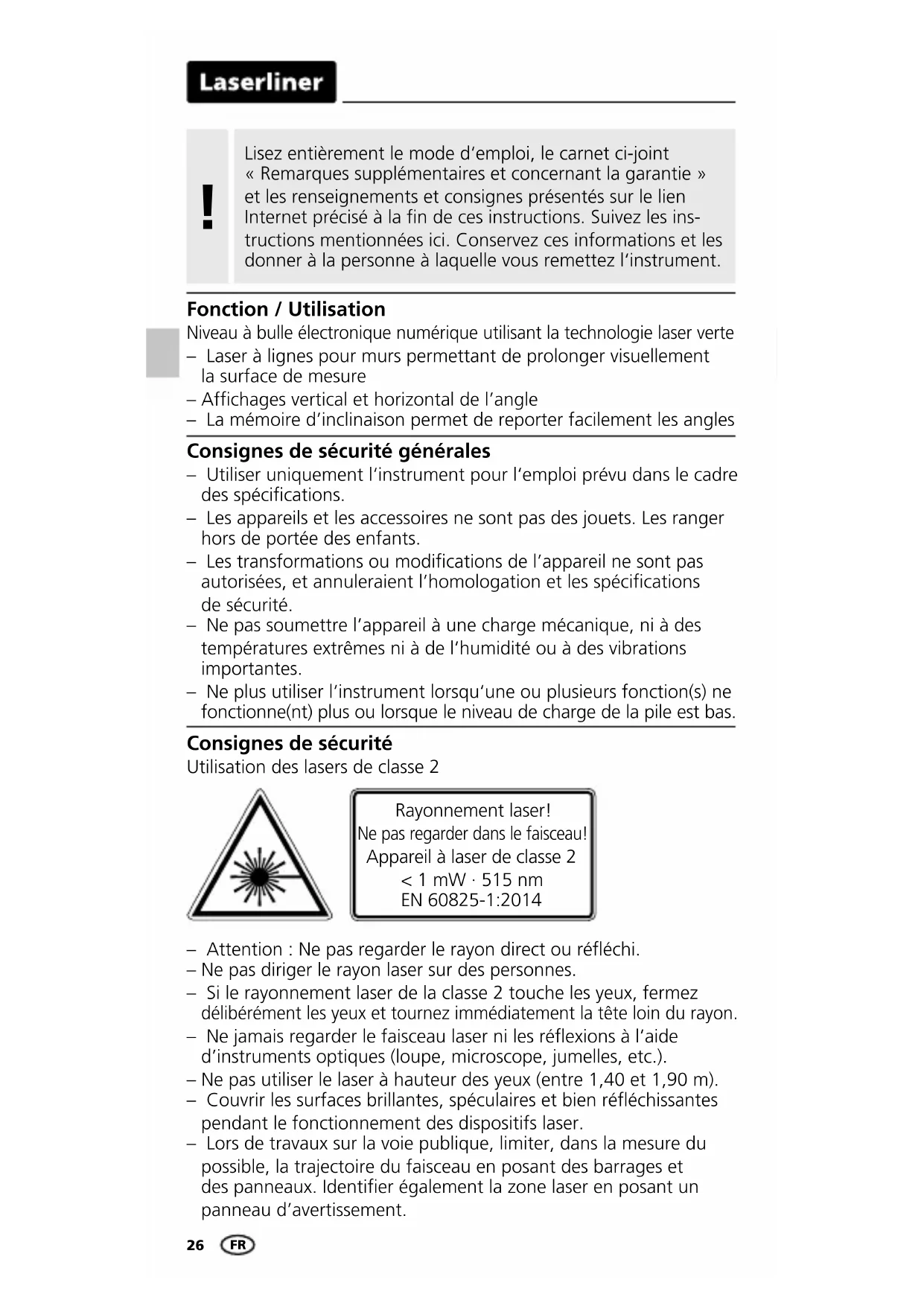 Tekniske data Nøjagtighed elektronisk måling ± 0,1° ved 0° … 1° ± 0,1° ved 89° … 90° ± 0,2° ved 1° … 89° Visningsnøjagtighed 1 decimal Libellenøjagtighed ± 0,5 mm/m Laserklasse 2 / < 1 mW Laserbølgelængde 515 nm Arbejdsbetingelser 0 ... 40°C, luftfugtighed maks. 80% rH, Ikke-konden- serende, arbejdshøjde maks. 2000 m.o.h. Opbevaringsbetingelser -10°C ... 60°C, luftfugtighed maks. 80% rH Strømkilde 2 x 1,5V (AAA/LR03) Mål (B x H x D) G40 400 x 66 x 30 mm Mål (B x H x D) G80 800 x 66 x 30 mm Vægt (inkl. batterier) G40 / G80 566 g / 966 g Forbehold for tekniske ændringer. 18W44 EU-bestemmelser og bortskaffelse Apparatet opfylder alle påkrævede standarder for fri vareomsætning inden for EU. Dette produkt er et elapparat og skal indsamles og bortskaffes separat i henhold til EF-direktivet for (brugte) elapparater. Flere sikkerhedsanvisninger og supplerende tips på: http://laserliner.com/info?an=AHH Fare pga. stærke magnetfelter Stærke magnetfelter kan have skadelige virkninger på personer med implantater (fx pacemakere) og på elektromekaniske apparater (fx magnetkort, mekaniske ure, nmekanik, harddiske). Med hensyn til stærke magnetfelters virkning på personer skal man iagttage de relevante nationale regler og bestemmelser; dette vil fx i Tyskland sige brancheforeningens forskrift BGV B11 §14 „Elektro- magnetiske felter“. For at undgå generende påvirkninger skal man altid holde magne- terne i en afstand på mindst 30 cm fra enhver form for følsomme implantater og apparater. DA26 Consignes de sécurité Utilisation des lasers de classe 2 – Attention : Ne pas regarder le rayon direct ou rééchi. – Ne pas diriger le rayon laser sur des personnes. – Si le rayonnement laser de la classe 2 touche les yeux, fermez délibérément les yeux et tournez immédiatement la tête loin du rayon. – Ne jamais regarder le faisceau laser ni les réexions à l’aide d’instruments optiques (loupe, microscope, jumelles, etc.). – Ne pas utiliser le laser à hauteur des yeux (entre 1,40 et 1,90 m). – Couvrir les surfaces brillantes, spéculaires et bien rééchissantes pendant le fonctionnement des dispositifs laser. – Lors de travaux sur la voie publique, limiter, dans la mesure du possible, la trajectoire du faisceau en posant des barrages et des panneaux. Identier également la zone laser en posant un panneau d’avertissement. Rayonnement laser! Ne pas regarder dans le faisceau! Appareil à laser de classe 2 < 1 mW · 515 nm EN 60825-1:2014 Consignes de sécurité générales – Utiliser uniquement l‘instrument pour l‘emploi prévu dans le cadre des spécications. – Les appareils et les accessoires ne sont pas des jouets. Les ranger hors de portée des enfants. – Les transformations ou modications de l’appareil ne sont pas autorisées, et annuleraient l’homologation et les spécications de sécurité. – Ne pas soumettre l’appareil à une charge mécanique, ni à des températures extrêmes ni à de l’humidité ou à des vibrations importantes. – Ne plus utiliser l‘instrument lorsqu‘une ou plusieurs fonction(s) ne fonctionne(nt) plus ou lorsque le niveau de charge de la pile est bas. Niveau à bulle électronique numérique utilisant la technologie laser verte – Laser à lignes pour murs permettant de prolonger visuellement la surface de mesure – Afchages vertical et horizontal de l’angle – La mémoire d’inclinaison permet de reporter facilement les angles Fonction / Utilisation Lisez entièrement le mode d‘emploi, le carnet ci-joint «Remarques supplémentaires et concernant la garantie» et les renseignements et consignes présentés sur le lien Internet précisé à la fin de ces instructions. Suivez les ins- tructions mentionnées ici. Conservez ces informations et les donner à la personne à laquelle vous remettez l‘instrument.
