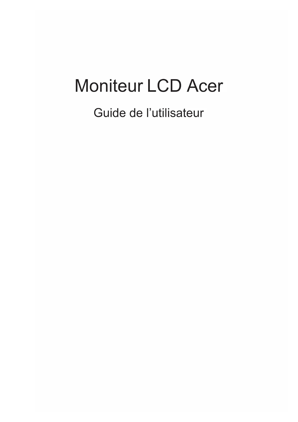 Moniteur LCD Acer Guide de l’utilisateurFrançais Droits d’auteur © 2020. Acer Incorporated. Tous Droits Réservés. Manuel de l'utilisateur du moniteur LCD Acer Diffusion initiale : 03/2020 Des modications peuvent être apportées de temps à autre aux informations contenues dans cette publication. Ces modications seront ajoutées aux nouvelles éditions de ce manuel ou dans les documents et publications supplémentaires. La présente société ne fournit aucune espèce de garantie expresse ou implicite, relative aux informations contenues dans ce manuel et n'offre notamment aucune garantie d'aucune sorte quant à la valeur marchande de ce produit ou son adéquation à une utilisation particulière. Enregistrez le numéro de série, la date d’achat, et le numéro du modèle dans l’espace prévu ci-dessous. Le numéro de série et le numéro de modèle sont imprimés sur l’étiquette collée sur le châssis. Toutes les correspondances concernant cette unité doivent inclure ces informations. Toute reproduction, transmission, transcription ou mise en mémoire de ce manuel ou partie sur un support quelconque, par quelque procédé que ce soit, notamment, électronique, mécanique, photocopie, enregistrement, ou autre, sont interdites sans l'autorisation écrite préalable d’Acer Incorporated. Manuel de l'utilisateur du moniteur LCD Acer Modèle : ______________________________________ No. de série : __________________________________ Date d’achat : __________________________________ Lieu d’achat : __________________________________ Acer et le logo Acer sont des marques commerciales déposées par Acer Incorporated. Les noms de produits ou marques commerciales d'autres sociétés sont utilisés ici à des fins d'identification uniquemen et sont la propriété de leurs détenteurs respectifs.iii Français Informations concernant votre sécurité et votre confort Consignes de Sécurité Lisez ces consignes attentivement. Conservez ce document pour des références ultérieures. Respectez tous les avertissements et instructions indiqués sur le produit. Remarques spéciales relatives aux moniteurs LCD Il est normal que les symptômes suivant se produisent en utilisant le moniteur LCD, ils n’indiquent aucun problème. En raison de la nature des lampes fluorescentes, l’image à l’écran peut être instable lors de la première utilisation. Eteignez, puis rallumez votre écran pour vous assurer de faire disparaître ce problème d’instabilité de l’image. Il est possible que la luminosité à l’écran soit légèrement irrégulière, elle dépend du motif de bureau que l’on utilise. L’écran LCD possède 99,99% ou plus de pixels efficaces. Il peut comporter un maximum de 0,01% pixels défectueux, qui peuvent se caractériser par un pixel manquant ou constamment allumé. Il est dans la nature des écrans LCD qu’une image rémanente de l’écran précédent reste après un changement d’image, surtout si cette image est restée affichée à l’écran pendant plusieurs heures. Dans ce cas-là, l’écran redeviendra normal lentement en changeant d’image ou en éteignant le moniteur pendant plusieurs heures. Nettoyage du moniteur Suivez attentivement les consignes ci-dessous lors du nettoyage du moniteur.• Débranchez toujours le moniteur avant de le nettoyer.• Utilisez un chiffon doux pour essuyer l’écran ainsi que l’avant et les côtés du coffret. Connexion et déconnexion de l'appareil Suivez les instructions suivantes lors de la connexion et de la déconnexion de l'alimentation du moniteur LCD :• Assurez-vous que le moniteur est fixé à à sa base avant de brancher le cordond'alimentation à la prise de courant.• Assurez-vous que le moniteur LCD et l'ordinateur sont allumés avant de connecter des câbles ou de débrancher le cordon d'alimentation.• Si le système a plusieurs sources d'alimentation, débranchez l'alimentation du système en déconnectant tous les cordons d' alimentation des alimentations.iv Français Accessibilité Assurez-vous que la prise d’alimentation dans laquelle vous branchez le cordon d’alimentation est facilement accessible et se situe au plus près possible de l’équipement. Si vous devez couper complètement l’alimentation de l’équipement, assurez-vous de débrancher le cordon d’alimentation de la prise murale. Écoute sécurisée Pour protéger votre audition, respectez les consignes ci-dessous.
