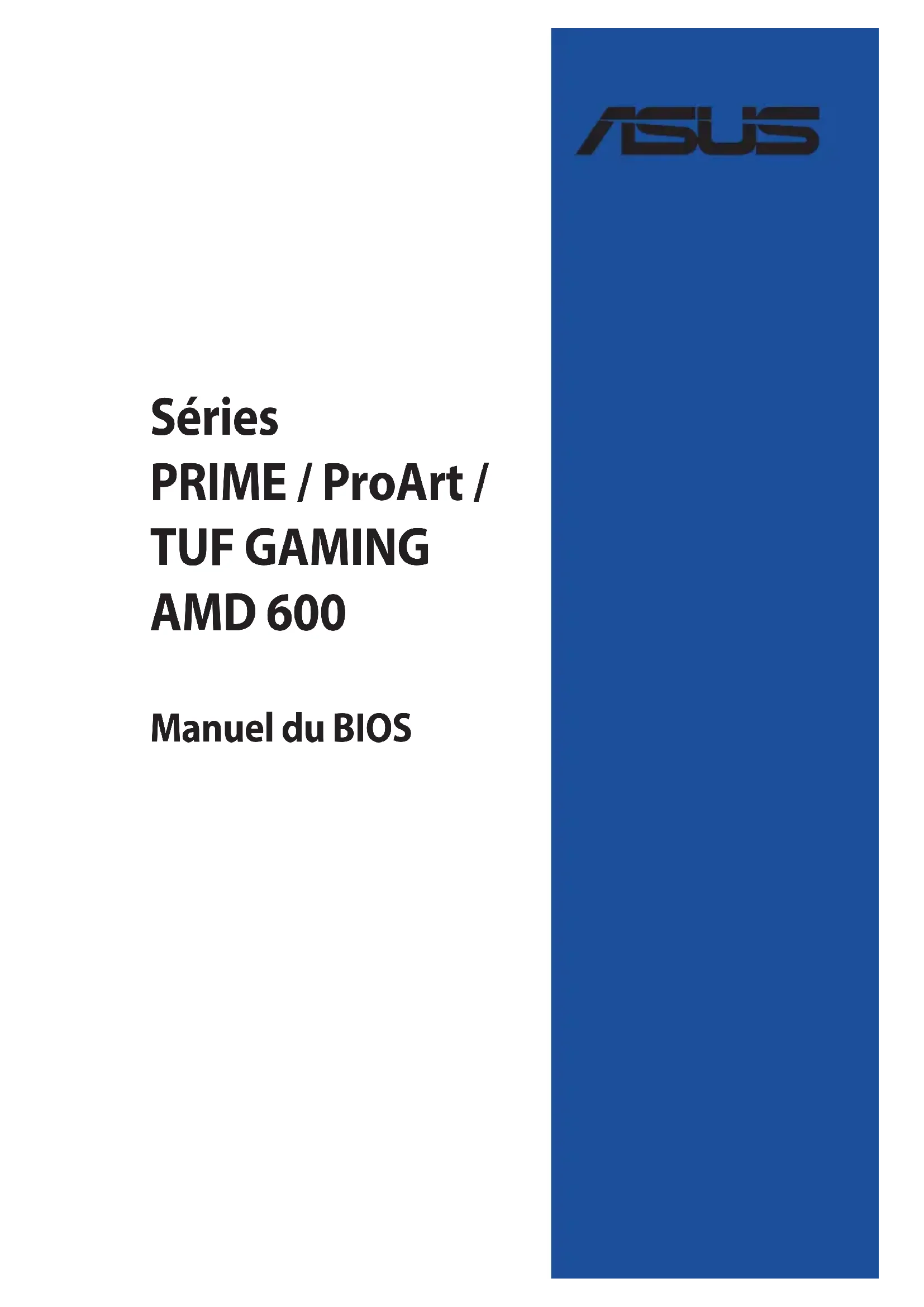 Séries PRIME / ProArt / TUF GAMING AMD 600 Manuel du BIOSF21968 Troisième Édition Avril 2023 Copyright © 2023 ASUSTeK COMPUTER INC. Tous droits réservés. Aucun extrait de ce manuel, incluant les produits et logiciels qui y sont décrits, ne peut être reproduit, transmis, transcrit, stocké dans un système de restitution, ou traduit dans quelque langue que ce soit sous quelque forme ou quelque moyen que ce soit, à l'exception de la documentation conservée par l'acheteur dans un but de sauvegarde, sans la permission écrite expresse de ASUSTeK COMPUTER INC. (“ASUS”). La garantie sur le produit ou le service ne sera pas prolongée si (1) le produit est réparé, modifié ou altéré, à moins que cette réparation, modification ou altération ne soit autorisée par écrit par ASUS ; ou (2) si le numéro de série du produit est dégradé ou manquant. ASUS fournit ce manuel "en l'état" sans garantie d'aucune sorte, explicite ou implicite, y compris, mais non limité aux garanties implicites ou aux conditions de commerciabilité ou d'adéquation à un but particulier. En aucun cas ASUS, ses directeurs, ses cadres, ses employés ou ses agents ne peuvent être tenus responsables des dégâts indirects, spéciaux, accidentels ou consécutifs (y compris les dégâts pour manque à gagner, pertes de profits, perte de jouissance ou de données, interruption professionnelle ou assimilé), même si ASUS a été prévenu de la possibilité de tels dégâts découlant de tout défaut ou erreur dans le présent manuel ou produit. Les spécifications et les informations contenues dans ce manuel sont fournies à titre indicatif seulement et sont sujettes à des modifications sans préavis, et ne doivent pas être interprétées comme un engagement de la part d'ASUS. ASUS n'est en aucun cas responsable d'éventuelles erreurs ou inexactitudes présentes dans ce manuel, y compris les produits et les logiciels qui y sont décrits. Les noms des produits et des sociétés qui apparaissent dans le présent manuel peuvent être, ou non, des marques commerciales déposées, ou sujets à copyrights pour leurs sociétés respectives, et ne sont utilisés qu'à des fins d'identification ou d'explication, et au seul bénéfice des propriétaires, sans volonté d'infraction.Manuel du BIOS des séries PRIME / ProArt / TUF GAMING AMD 600