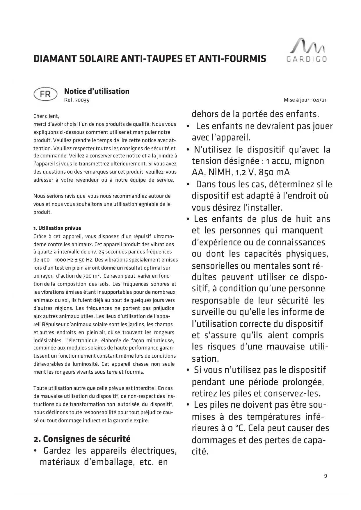 MODE D'EMPLOI 70035 Gardigo