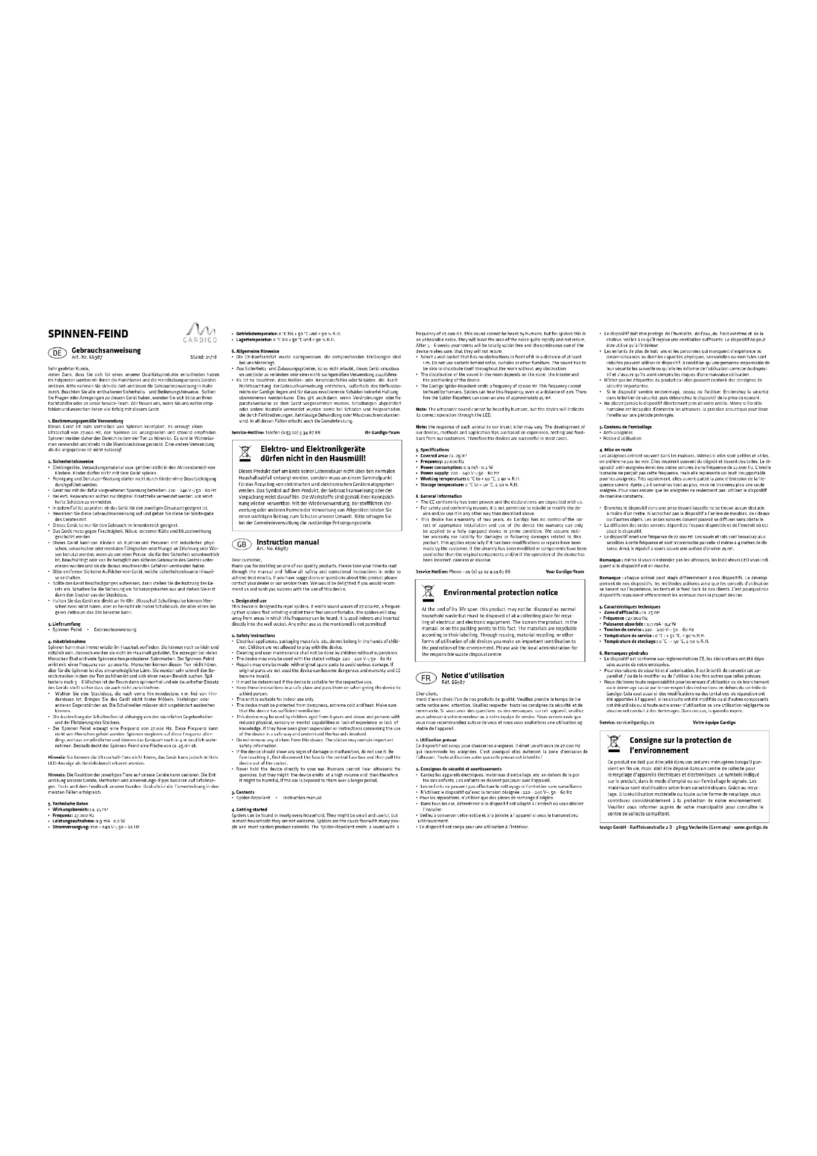 - Si le dispositif semble endommagé, cessez de l’utiliser. Enclenchez la sécurité dans le boîtier de sécurité, puis débranchez le dispositif de la prise de courant.• Ne placez jamais le dispositif directement près de votre oreille. Même si l’oreille humaine est incapable d’entendre les ultrasons, la pression acoustique peut léser l’oreille sur une période prolongée.3. Contenu de l’emballage• Anti-araignées • Notice d’utilisation4. Mise en route Les araignées entrent souvent dans les maisons. Mêmes si elles sont petites et utiles, on préfère ne pas les voir. Elles inspirent souvent du dégoût et tissent des toiles. Le di-spositif anti-araignées émet des ondes sonores à une fréquence de 27.000 Hz. L’oreille humaine ne perçoit pas cette fréquence, mais elle représente un bruit insupportable pour les araignées. Très rapidement, elles auront quitté la zone d’émission de la fré-quence sonore. Après 5 à 6 semaines tout au plus, vous ne trouverez plus une seule araignée. Pour vous assurer que les araignées ne reviennent pas, utilisez le dispositif de manière constante. • Branchez le dispositif dans une prise devant laquelle ne se trouve aucun obstacle à moins d’un mètre. N’accrochez pas le dispositif à l’arrière de meubles, de rideaux ou d’autres objets. Les ondes sonores doivent pouvoir se diffuser sans obstacle.• La diffusion des ondes sonores dépend de l’espace disponible et de l’endroit où est placé le dispositif.• Le dispositif émet une fréquence de 27.000 Hz. Les souris et rats sont beaucoup plus sensibles à cette fréquence et sont incommodée par celle-ci même à 4 mètres de dis-tance. Ainsi, le répulsif à souris couvre une surface d’environ 25 m².Remarque : même si vous n’entendez pas les ultrasons, les indicateurs LED vous indi-quent si le dispositif est en marche. Remarque: chaque animal peut réagir diéremment à nos dispositifs. Le dévelop- pement de nos dispositifs, les méthodes utilisées ainsi que les conseils d’utilisation se basent sur l’expérience, les tests et le feed-back de nos clients. C’est pourquoi nos dispositifs repoussent ecacement les animaux dans la plupart des cas. 5. Caractéristiques techniques• Zone d’efficacité : ca. 25 m²• Fréquence : 27.000 Hz• Puissance absorbée : 0,9 mA · 0,2 W• Tension de service : 220 – 240 V~; 50 – 60 Hz• Température de service : 0 °C : + 50 °C, ≤ 90 % R.H. • Température de stockage : 0 °C : + 50 °C, ≤ 90 % R.H.6. Remarques générales• Le dispositif est conforme aux réglementations CE, les déclarations ont été dépo-sées auprès de notre entreprise.• Pour des raisons de sécurité et d’autorisation, il est interdit de convertir cet ap-pareil et / ou de le modifier ou de l’utiliser à des fins autres que celles prévues.• Nous déclinons toute responsabilité pour les erreurs d’utilisation ou de branchement ou le dommage causé par le non-respect des instructions en dehors du contrôle de Gardigo. Cela vaut aussi si des modifications ou des tentatives de réparation ont été apportées à l’appareil, si les circuits ont été modifiés ou si d'autres composants ont été utilisés ou si toute autre erreur d’utilisation ou une utilisation négligente ou abusive ont conduit à des dommages. Dans ces cas, la garantie expire. Service: service@gardigo.de Votre équipe Gardigo Consigne sur la protection de l’environnement Ce produit ne doit pas être jeté dans vos ordures ménagères lorsqu’il par- vient en fin vie, mais doit être déposé dans un centre de collecte pour le recyclage d’appareils électriques et électroniques. Le symbole indiqué sur le produit, dans le mode d’emploi ou sur l’emballage le signale. Les matériaux sont réutilisables selon leurs caractéristiques. Grâce au recyc- lage, à la réutilisation matérielle ou toute autre forme de recyclage, vous contribuez considérablement à la protection de notre environnement. Veuillez vous informer auprès de votre municipalité pour connaître le centre de collecte compétent. tevigo GmbH · Raiffeisenstraße 2 D · 38159 Vechelde (Germany) · www.gardigo.deManual de instrucciones Art.-No. 66987 Estimado cliente, le agradecemos que haya elegido uno de nuestros productos de calidad. A continuaci- ón explicamos en detalle las funciones y el manejo de nuestro aparato. Tómese algo de tiempo para leer las instrucciones con atención hasta el final. Tenga en cuenta todas las indicaciones de seguridad y manejo. Si tiene alguna pregunta o algún comentario acerca de este aparato, póngase en contacto con su distribuidor o con nuestro equipo de atención al cliente. Le agradeceríamos que nos recomendara y le deseamos muchos éxitos con el uso de este.