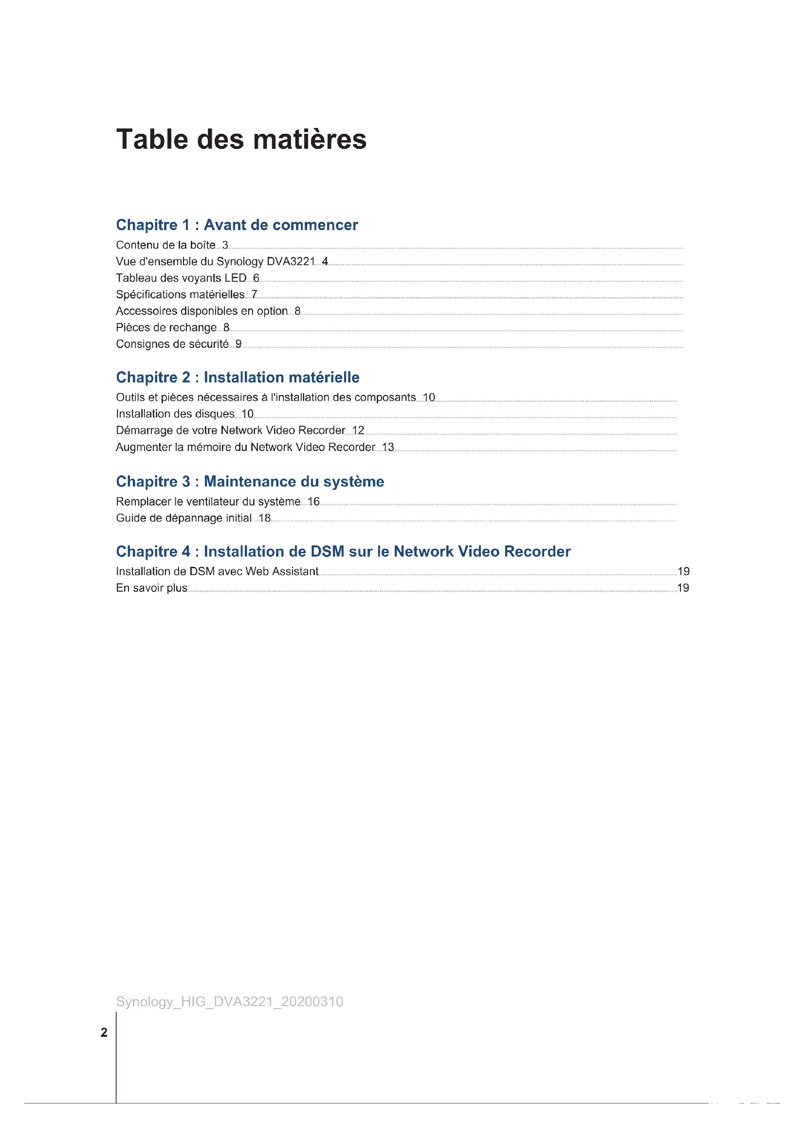 Contenu de la boîte 3 Vue d'ensemble du Synology DVA3221 4 Tableau des voyants LED 6 Spécications matérielles 7 Accessoires disponibles en option 8 Pièces de rechange 8 Consignes de sécurité 9