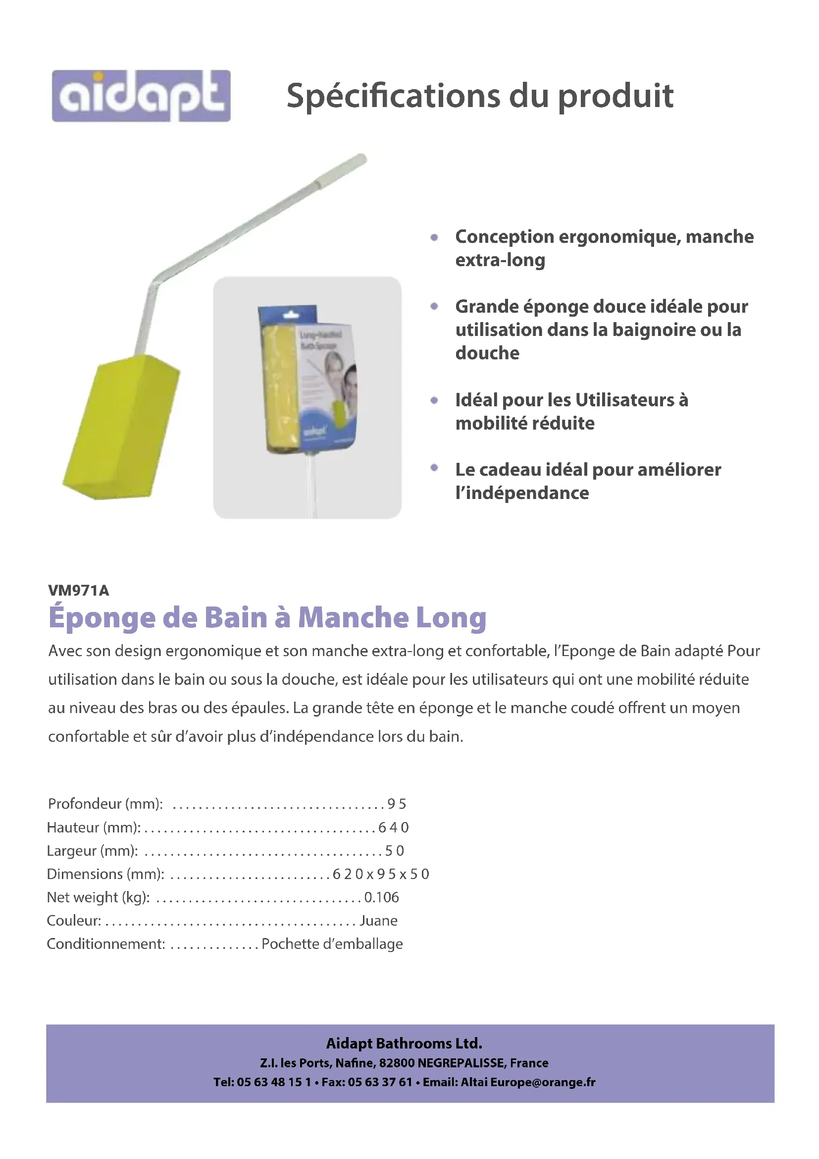Spécications du produit VM971A Éponge de Bain à Manche Long Avec son design ergonomique et son manche extra-long et confortable, l’Eponge de Bain adapté Pour utilisation dans le bain ou sous la douche, est idéale pour les utilisateurs qui ont une mobilité réduite au niveau des bras ou des épaules. La grande tête en éponge et le manche coudé orent un moyen confortable et sûr d’avoir plus d’indépendance lors du bain. Profondeur (mm): .................................95 Hauteur (mm): ....................................640 Largeur (mm): .....................................50 Dimensions (mm): .........................620x95x50 Net weight (kg): ................................0.106 Couleur: ....................................... Juane Conditionnement: ..............Pochette d’emballage Conception ergonomique, manche extra-long Grande éponge douce idéale pour utilisation dans la baignoire ou la douche Idéal pour les Utilisateurs à mobilité réduite Le cadeau idéal pour améliorer l’indépendance Aidapt Bathrooms Ltd. Z.I. les Ports, Nane, 82800 NEGREPALISSE, FranceTel: 05 63 48 15 1 • Fax: 05 63 37 61 • Email: Altai Europe@orange.fr