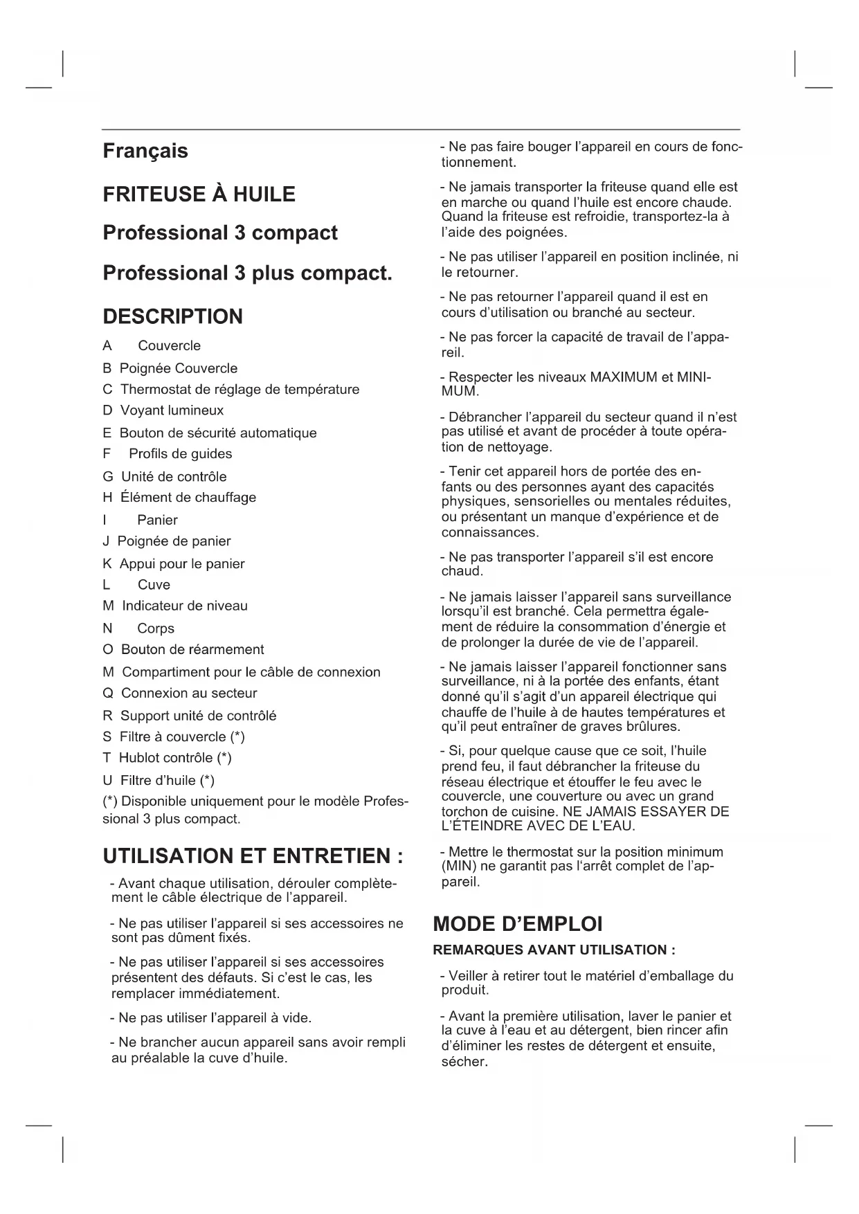 - Whenthefoodhasbeenfriedsufciently, remove the lid, lift the basket and hang it with the hook in the tank in order to allow draining the excess of oil from the food.- Dismantle the appliance as follows: - Take off the lid - Remove the basket and take out the electri- cal equipment - Remove the tank - Carefully pour the used oil from the bowl into a container(notthesink),accordingtotheregu- lations in force for the treatment and disposal of waste. - Except for the power unit and the mains con- nection, all the parts can be cleaned with de- tergent and water or in washing up liquid. Rinse thoroughly to remove all traces of detergent - Clean the electrical equipment and the mains connection with a damp cloth and dry. DO NOT IMMERSE IN WATER OR ANY OTHER LIQUID. - Clean the equipment using a damp cloth with a few drops of washing-up liquid and then dry. - Do not use solvents, or products with an acid or base pH such as bleach, or abrasive products, for cleaning the appliance. - Do not submerge the appliance in water or any other liquid, or place it under a running tap. - If the appliance is not in good condition of cleanliness, its surface may degrade and inexorably affect the duration of the appliance’s useful life and could become unsafe to use. - The following parts are suitable for cleaning inhotsoapywaterorinadishwasher(usinga softcleaningprogram): - Basket - Lid - Tank - BodyFrançais FRITEUSE À HUILE Professional 3 compact Professional 3 plus compact. DESCRIPTION A Couvercle B Poignée Couvercle C Thermostat de réglage de température D Voyant lumineux E Bouton de sécurité automatique F Prolsdeguides G Unité de contrôle H Élément de chauffage I Panier J Poignée de panier K Appui pour le panier L Cuve M Indicateur de niveau N Corps O Bouton de réarmement M Compartiment pour le câble de connexion Q Connexion au secteur R Support unité de contrôlé S Filtre à couvercle (*) T Hublot contrôle (*) U Filtre d’huile (*) (*) Disponible uniquement pour le modèle Profes- sional 3 plus compact. UTILISATION ET ENTRETIEN : - Avant chaque utilisation, dérouler complète- ment le câble électrique de l’appareil. - Ne pas utiliser l’appareil si ses accessoires ne sontpasdûmentxés. - Ne pas utiliser l’appareil si ses accessoires présentent des défauts. Si c’est le cas, les remplacer immédiatement. - Ne pas utiliser l’appareil à vide. - Ne brancher aucun appareil sans avoir rempli au préalable la cuve d’huile. - Ne pas faire bouger l’appareil en cours de fonc- tionnement. - Ne jamais transporter la friteuse quand elle est en marche ou quand l’huile est encore chaude. Quand la friteuse est refroidie, transportez-la à l’aide des poignées. - Ne pas utiliser l’appareil en position inclinée, ni le retourner. - Ne pas retourner l’appareil quand il est en cours d’utilisation ou branché au secteur. - Ne pas forcer la capacité de travail de l’appa- reil. - Respecter les niveaux MAXIMUM et MINI- MUM. - Débrancher l’appareil du secteur quand il n’est pas utilisé et avant de procéder à toute opéra- tion de nettoyage. - Tenir cet appareil hors de portée des en- fants ou des personnes ayant des capacités physiques, sensorielles ou mentales réduites, ou présentant un manque d’expérience et de connaissances. - Ne pas transporter l’appareil s’il est encore chaud. - Ne jamais laisser l’appareil sans surveillance lorsqu’il est branché. Cela permettra égale- ment de réduire la consommation d’énergie et de prolonger la durée de vie de l’appareil. - Ne jamais laisser l’appareil fonctionner sans surveillance, ni à la portée des enfants, étant donné qu’il s’agit d’un appareil électrique qui chauffe de l’huile à de hautes températures et qu’il peut entraîner de graves brûlures. - Si, pour quelque cause que ce soit, l’huile prend feu, il faut débrancher la friteuse du réseau électrique et étouffer le feu avec le couvercle, une couverture ou avec un grand torchon de cuisine. NE JAMAIS ESSAYER DE L’ÉTEINDRE AVEC DE L’EAU. - Mettre le thermostat sur la position minimum (MIN) ne garantit pas l‘arrêt complet de l’ap- pareil.