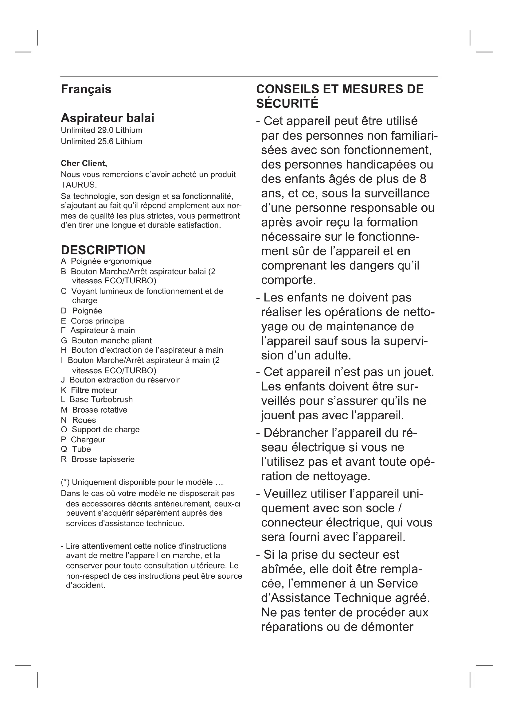 - Safely remove the battery from its housing. This appliance complies with Directive 2014/35/ EC on Low Voltage, with Directive 2014/30/EU on Electromagnetic Compatibility, with Directive 2011/65/EU on restrictions on the use of certain dangerous substances in electrical and electronic appliances and with Directive 2009/125/EC on the ecological design requirements applicable to products related to energy.Français Aspirateur balai Unlimited 29.0 Lithium Unlimited 25.6 Lithium Cher Client, Nous vous remercions d’avoir acheté un produit TAURUS. Sa technologie, son design et sa fonctionnalité, s’ajoutant au fait qu’il répond amplement aux nor- mes de qualité les plus strictes, vous permettront d’en tirer une longue et durable satisfaction. DESCRIPTION A Poignée ergonomique B Bouton Marche/Arrêt aspirateur balai (2 vitesses ECO/TURBO) C Voyant lumineux de fonctionnement et de charge D Poignée E Corps principal F Aspirateur à main G Bouton manche pliant H Bouton d’extraction de l’aspirateur à main I Bouton Marche/Arrêt aspirateur à main (2 vitesses ECO/TURBO) J Bouton extraction du réservoir K Filtre moteur L Base Turbobrush M Brosse rotative N Roues O Support de charge P Chargeur Q Tube R Brosse tapisserie (*) Uniquement disponible pour le modèle … Dans le cas où votre modèle ne disposerait pas des accessoires décrits antérieurement, ceux-ci peuvent s’acquérir séparément auprès des services d’assistance technique. - Lire attentivement cette notice d’instructions avant de mettre l’appareil en marche, et la conserver pour toute consultation ultérieure. Le non-respect de ces instructions peut être source d’accident.