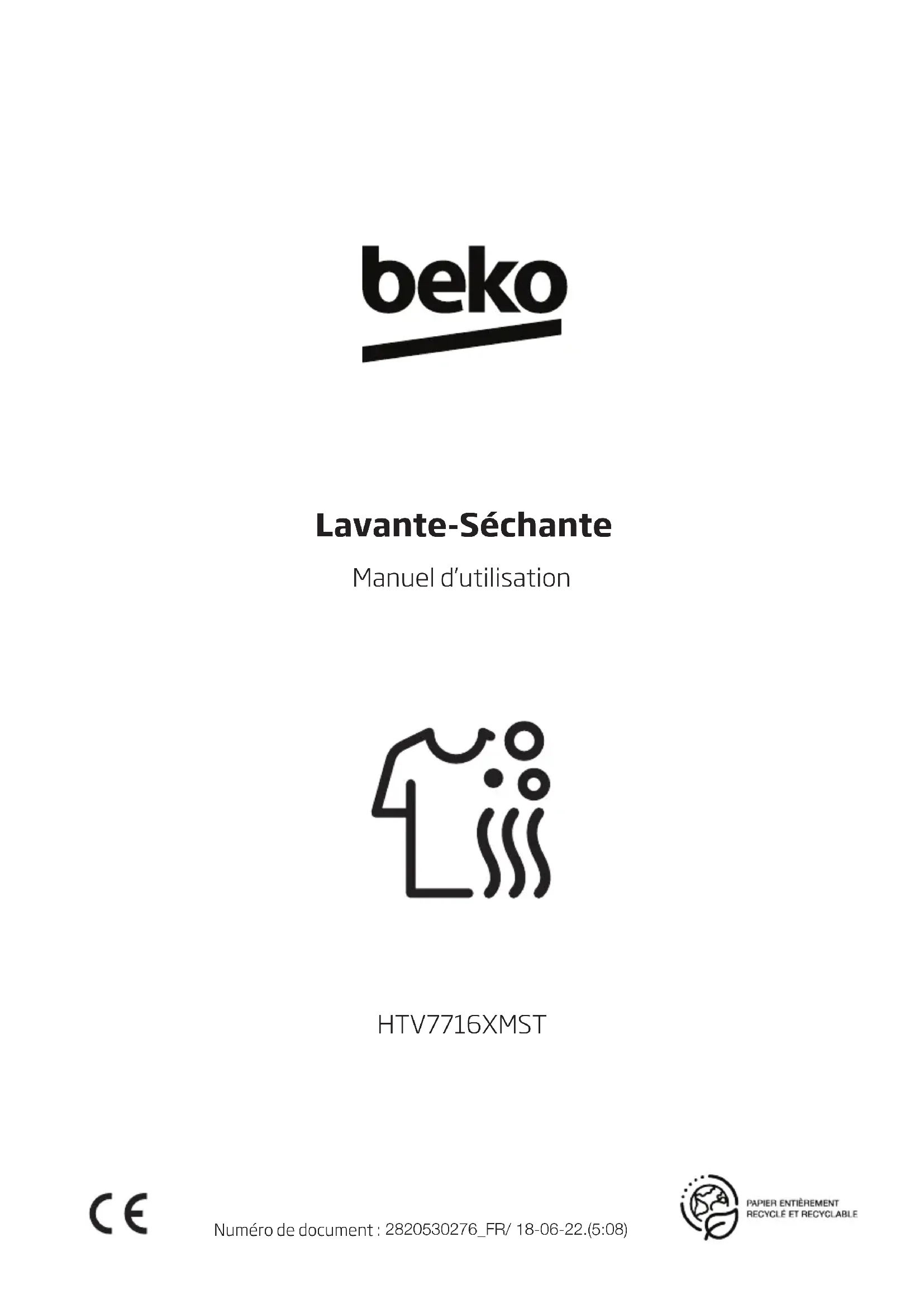 Lavante-Séchante Manuel d’utilisation HTV7716XMST 2820530276_FR/ 18-06-22.(5:08) Numéro de document :Ce produit a été fabriqué conformément aux conditions écologiques les plus récentes. Veuillez d’abord lire ce manuel d’utilisation ! Chère cliente, cher client, Nous vous remercions d'avoir choisi un appareil Beko. Nous espérons que ce produit fabriqué à base de matériaux de qualité supérieure et issu de la technologie de pointe vous donnera des résultats optimaux. Pour cette raison, nous vous conseillons de lire attentivement tout le manuel d’utilisation de votre produit et les documents supplémentaires avant de vous en servir, et de le conserver ensuite pour une utilisation ultérieure. Si l'appareil venait à être remis à un autre utilisateur, pensez à lui remettre aussi le manuel d'utilisation. Respectez tous les avertissements et informations contenus dans le manuel d'utilisation. Les symboles suivants sont utilisés tout au long du manuel d'utilisation :