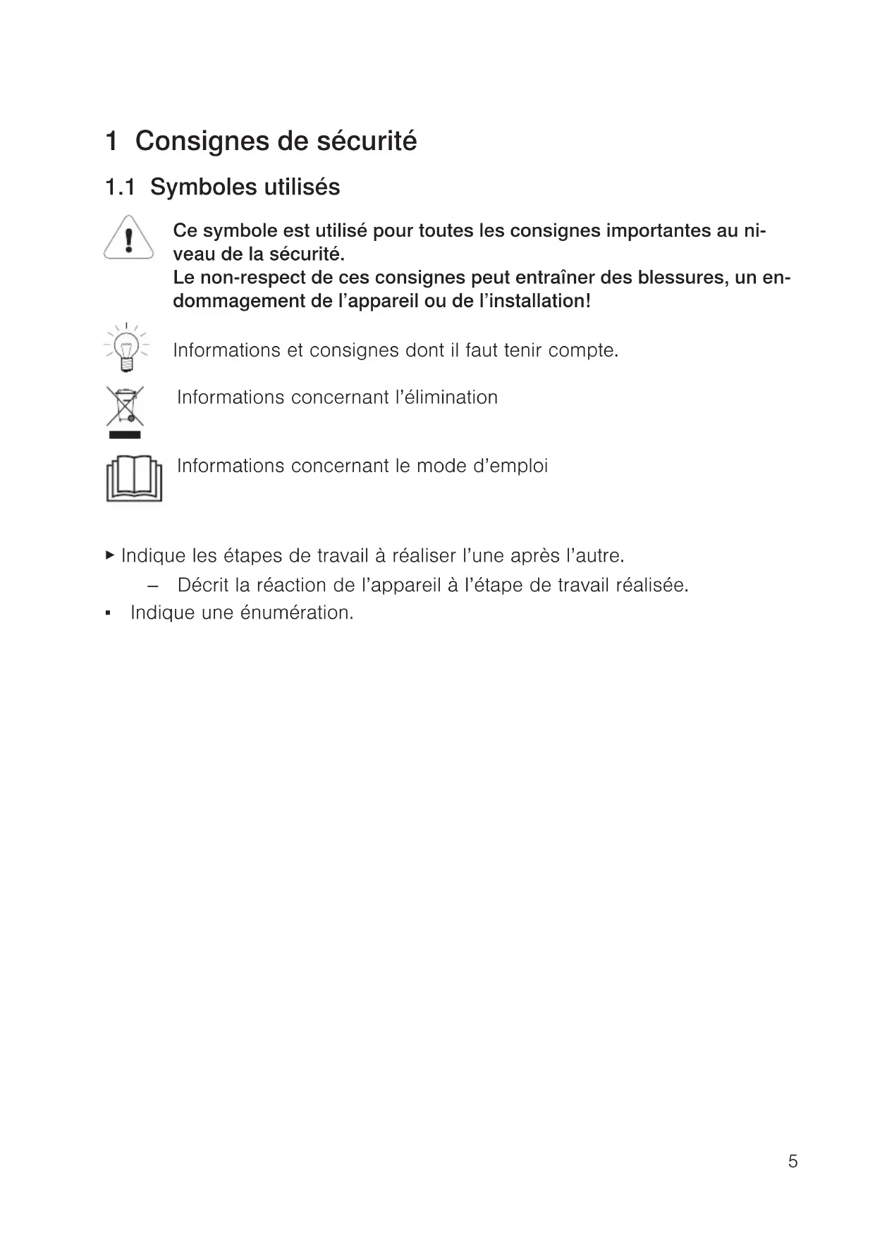 Ce symbole est utilisé pour toutes les consignes importantes au ni- veau de la sécurité. Le non-respect de ces consignes peut entraîner des blessures, un en- dommagement de l’appareil ou de l’installation! Informations et consignes dont il faut tenir compte. Informations concernant l’élimination Informations concernant le mode d’emploi