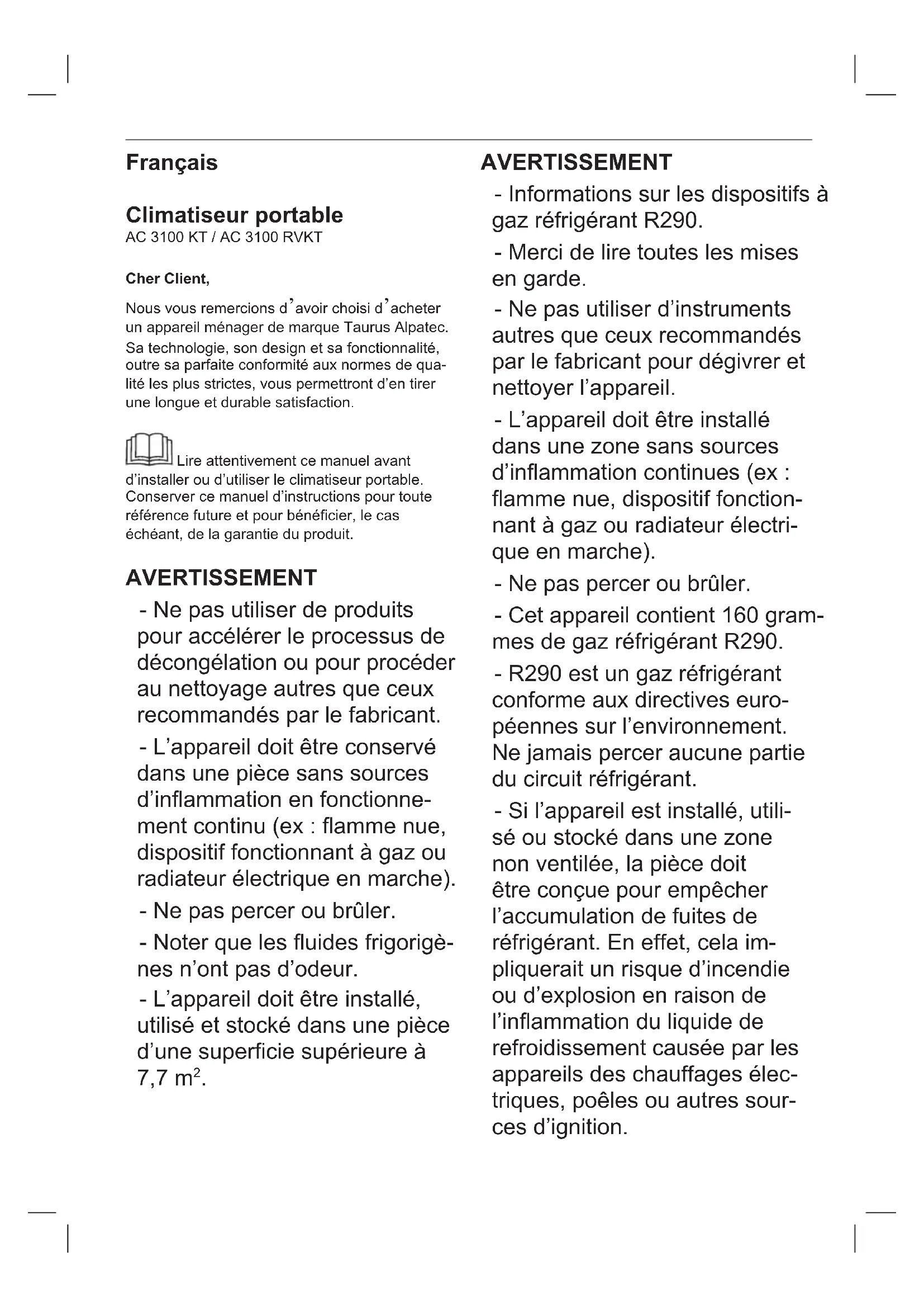 Cher Client, Nous vous remercions d’avoir choisi d’acheter un appareil ménager de marque Taurus Alpatec. Sa technologie, son design et sa fonctionnalité, outre sa parfaite conformité aux normes de qua- lité les plus strictes, vous permettront d’en tirer une longue et durable satisfaction. Lire attentivement ce manuel avant d’installer ou d’utiliser le climatiseur portable. Conserver ce manuel d’instructions pour toute référence future et pour bénécier, le cas échéant, de la garantie du produit. AVERTISSEMENT - Ne pas utiliser de produits pour accélérer le processus de décongélation ou pour procéder au nettoyage autres que ceux recommandés par le fabricant. - L’appareil doit être conservé dans une pièce sans sources d’inammation en fonctionne- ment continu (ex : amme nue, dispositif fonctionnant à gaz ou radiateur électrique en marche). - Ne pas percer ou brûler. - Noter que les uides frigorigè- nes n’ont pas d’odeur. - L’appareil doit être installé, utilisé et stocké dans une pièce d’une supercie supérieure à 7,7 m