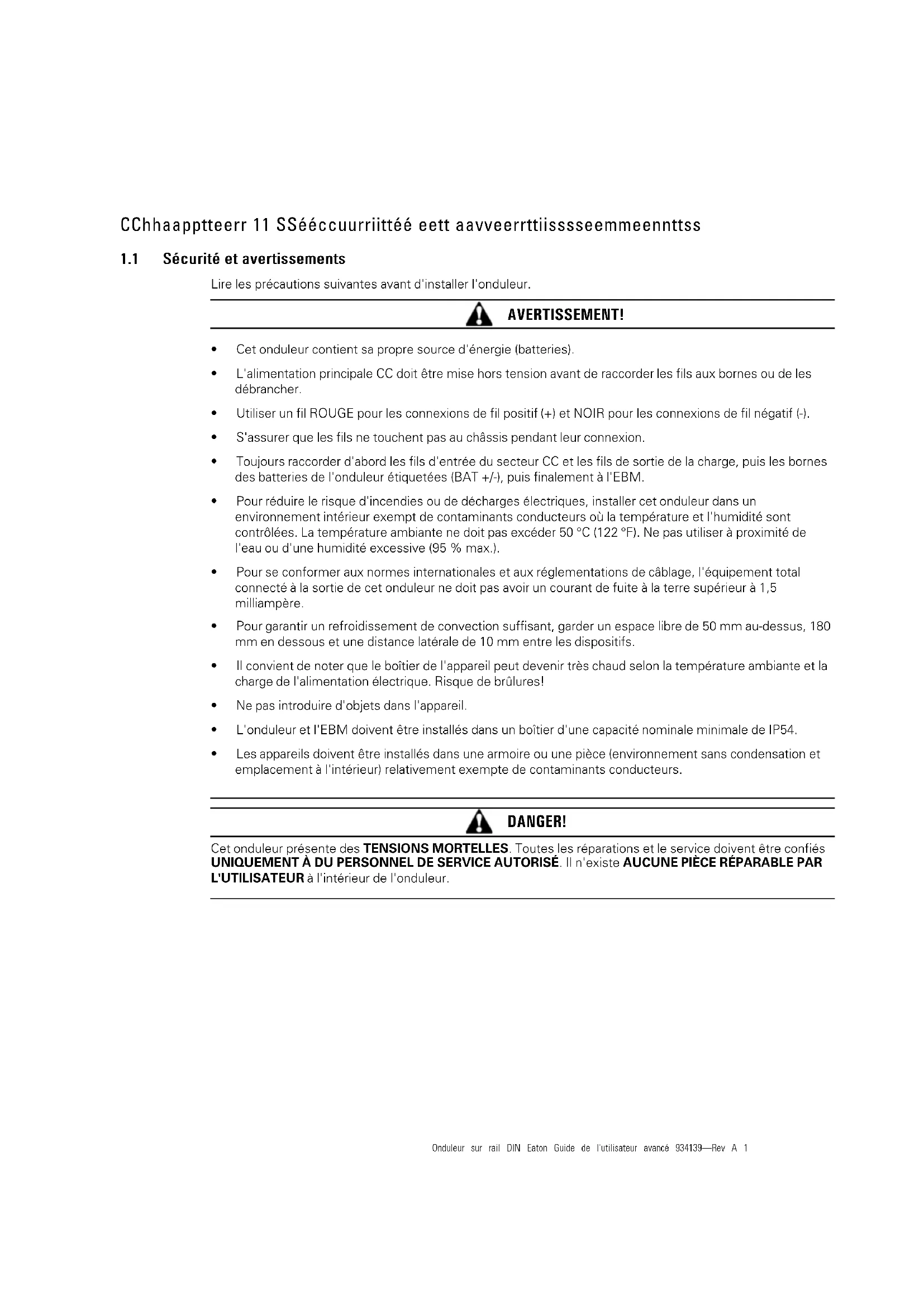 - Les appareils doivent être installés dans une armoire ou une pièce (environnement sans condensation et emplacement à l'intérieur) relativement exempte de contaminants conducteurs. DANGER! Cet onduleur présente des TENSIONS MORTELLES. Toutes les réparations et le service doivent être confiés UNIQUEMENT À DU PERSONNEL DE SERVICE AUTORISÉ. Il n'existe AUCUNE PIÈCE RÉPARABLE PAR L'UTILISATEUR à l'intérieur de l'onduleur.2 Onduleur sur rail DIN Eaton Guide de l'utilisateur avancé 934139—Rev A ATTENTION!
