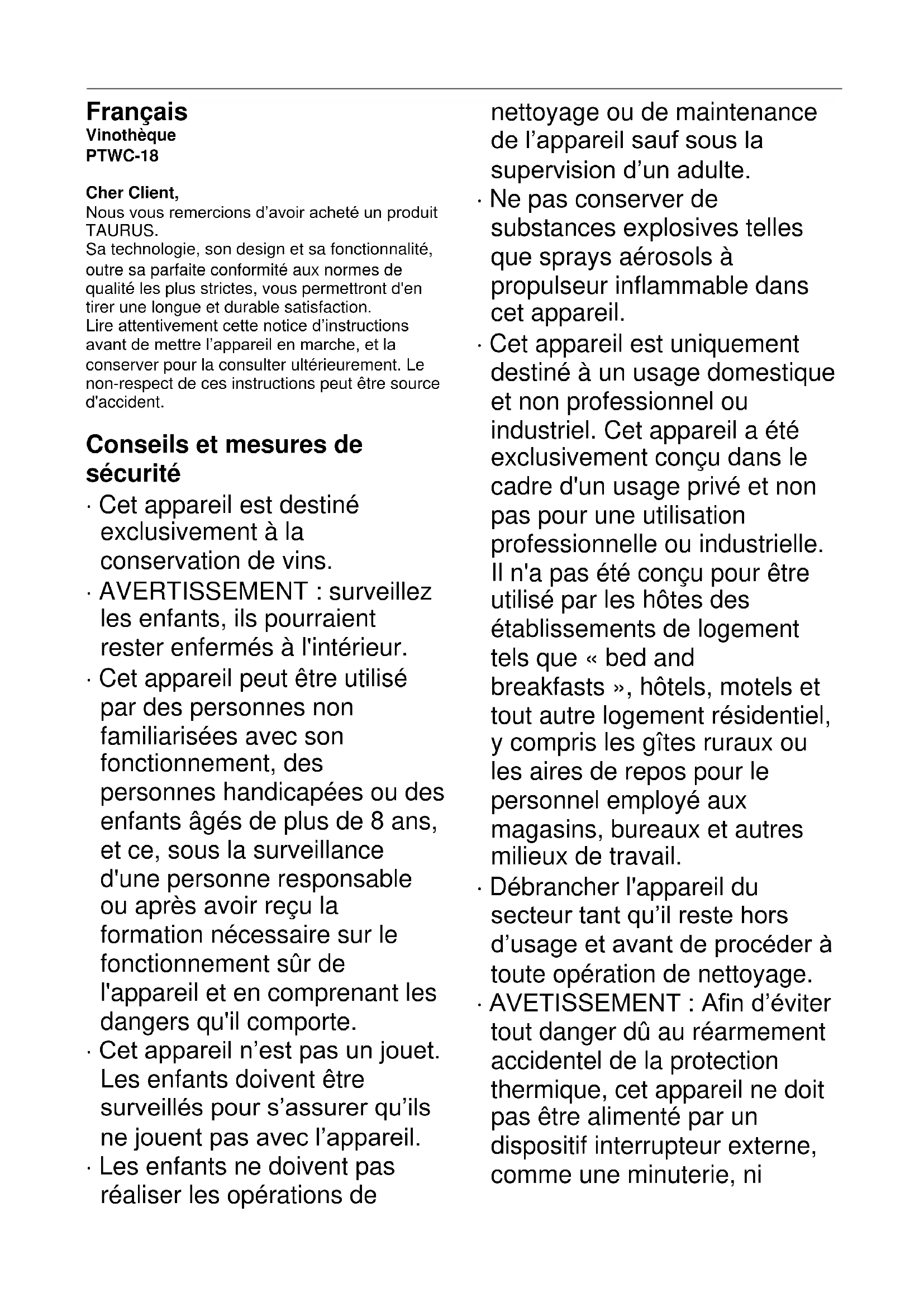 PTWC18 - Cave à vin TAURUS - Notice d'utilisation et mode d'emploi gratuit