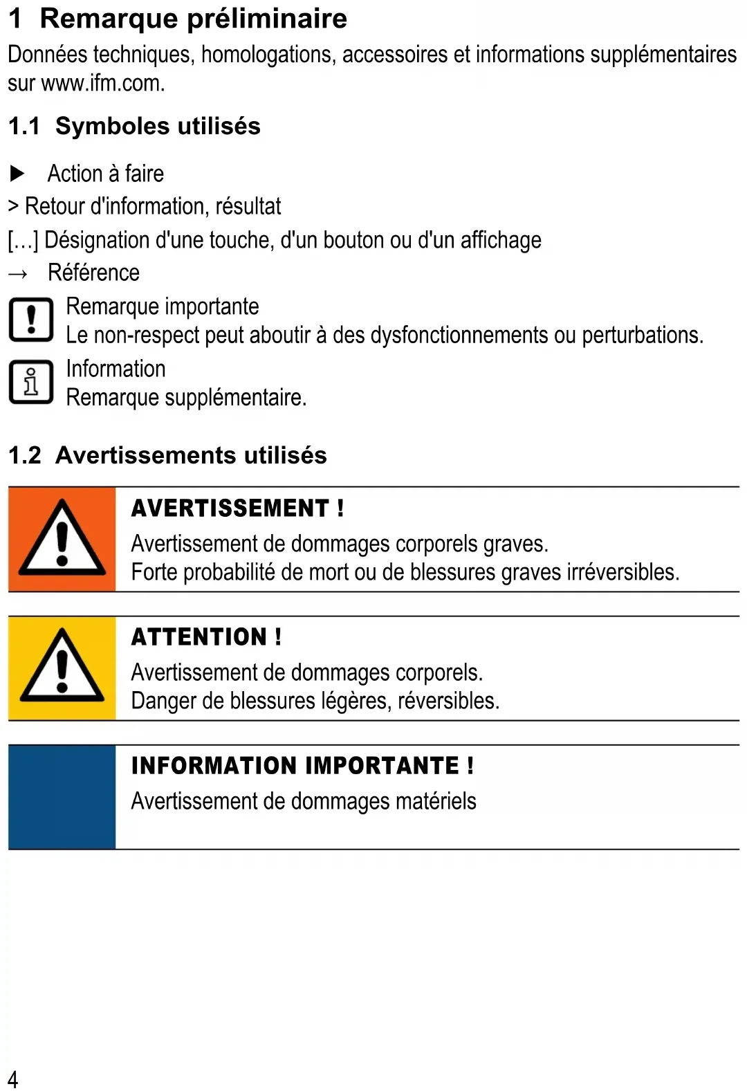 Ce document est la notice originale.4 1 Remarque préliminaire Données techniques, homologations, accessoires et informations supplémentaires sur www.ifm.com.