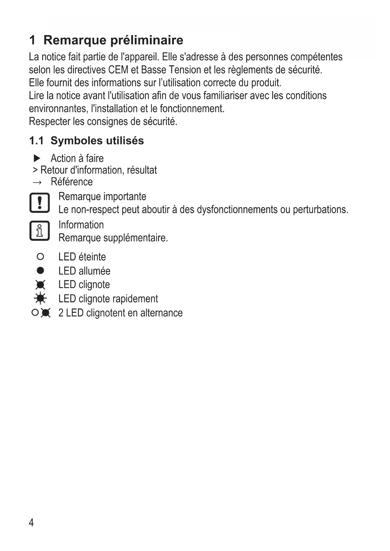 - Référence Remarque importante Le non-respect peut aboutir à des dysfonctionnements ou perturbations Information Remarque supplémentaire LED éteinte LED allumée LED clignote LED clignote rapidement 2 LED clignotent en alternance5