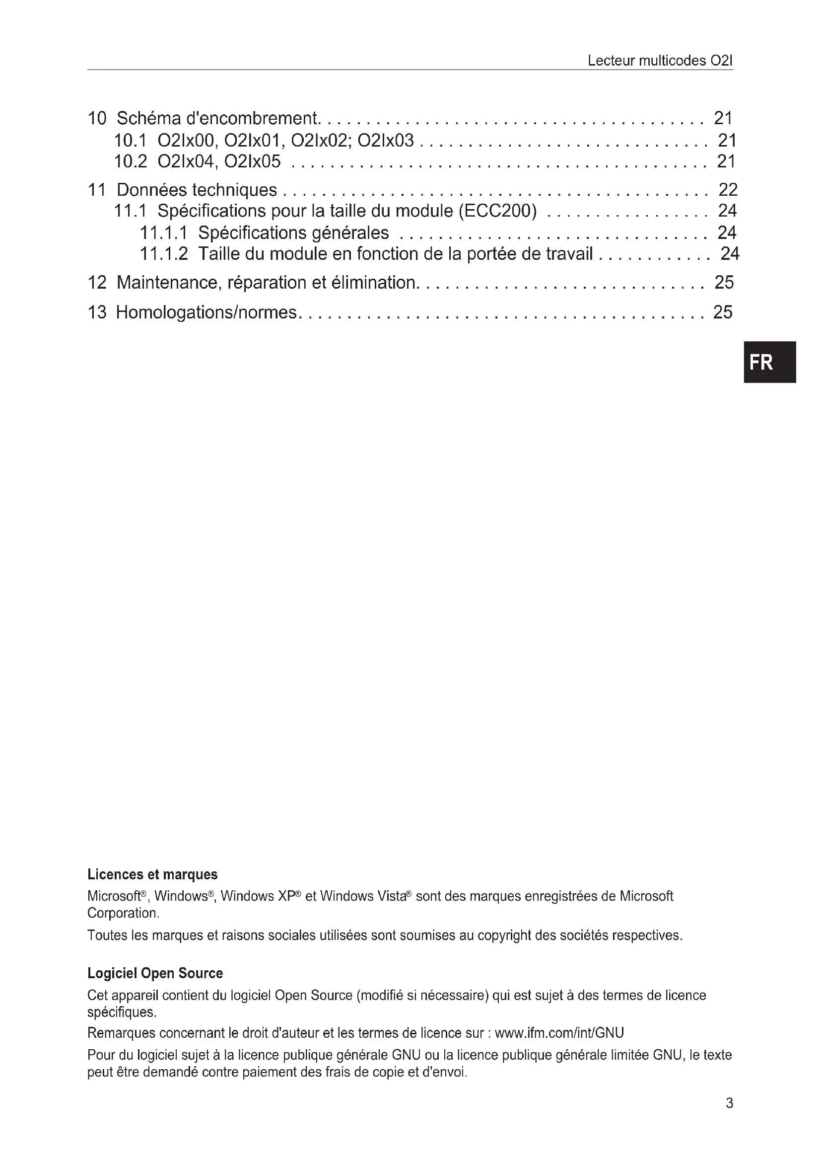 10 Schéma d'encombrement 21 101 O2Ix00, O2Ix01, O2Ix02; O2Ix03 21 102 O2Ix04, O2Ix05 21 11 Données techniques 22 111 Spécifications pour la taille du module (ECC200) 24 1111 Spécifications générales 24 1112 Taille du module en fonction de la portée de travail 24 12 Maintenance, réparation et élimination 25 13 Homologations/normes 25 Licences et marques Microsoft