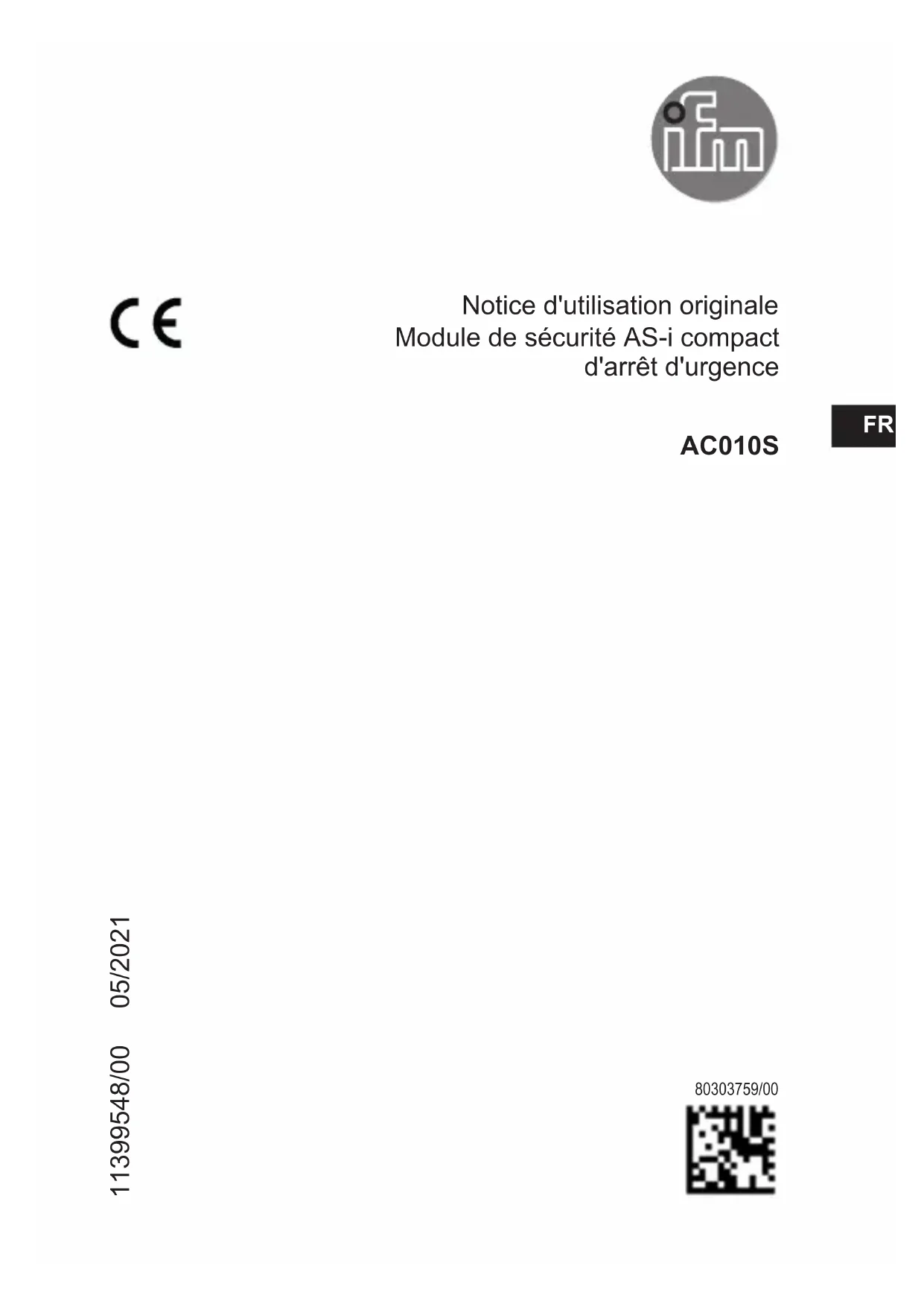 Notice d'utilisation originale Module de sécurité AS-i compact d'arrêt d'urgence AC010S FRFR 11399548/00 05/2021 80303759/002 Contenu 1 Remarque préliminaire 3 11 Explication des symboles 3 2 Consignes de sécurité 3 21 Exigences relatives à la sécurité de l'application 4 3 Limite de fourniture 4 4 Fonctionnement et caractéristiques 5 5 Description du fonctionnement et consignes de raccordement 5 6 Montage 6 61 Eléments de service et d'indication 6 7 Raccordement électrique 7 8 Adressage 8 9 Fonctionnement 8 91 Temps de réponse 9 10 Données caractéristiques de sécurité9 11 Données techniques 10 12 Schéma d'encombrement 11 13 Correction de défauts 12 14 Maintenance, réparation et élimination 12 15 Homologations / certificats123