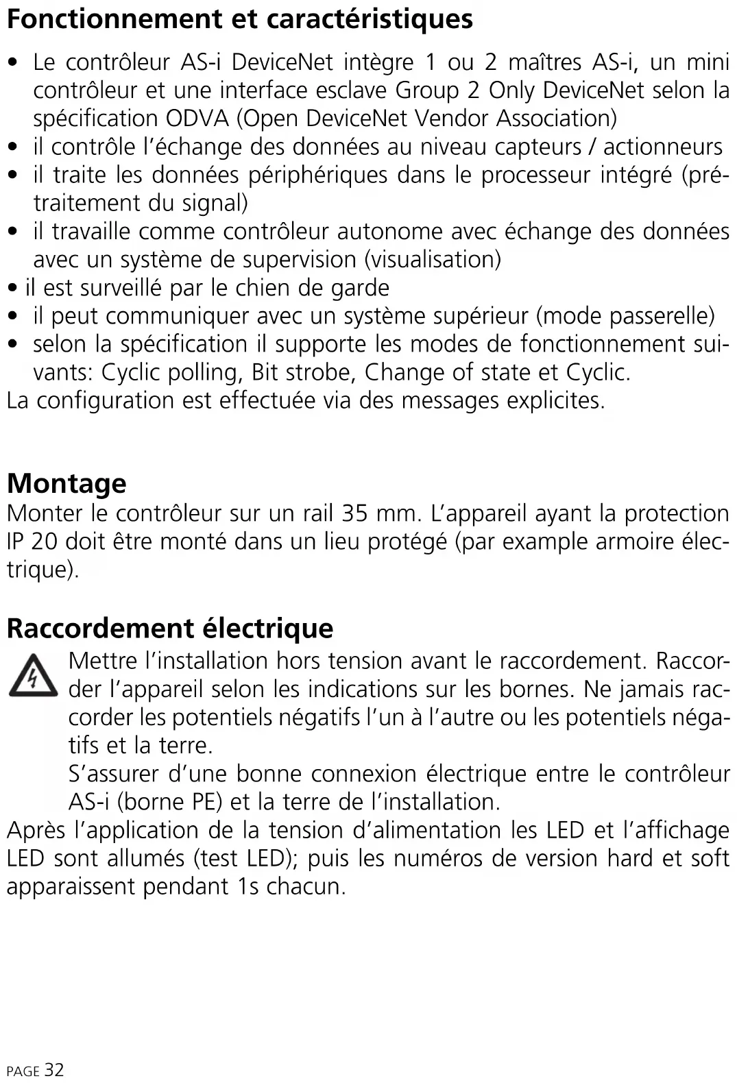 - selon la spécification il supporte les modes de fonctionnement sui- vants: Cyclic polling, Bit strobe, Change of state et Cyclic. La configuration est effectuée via des messages explicites. Montage Monter le contrôleur sur un rail 35 mm. L’appareil ayant la protection IP 20 doit être monté dans un lieu protégé (par example armoire élec- trique). Raccordement électrique Mettre l’installation hors tension avant le raccordement. Raccor- der l’appareil selon les indications sur les bornes. Ne jamais rac- corder les potentiels négatifs l’un à l’autre ou les potentiels néga- tifs et la terre. S’assurer d’une bonne connexion électrique entre le contrôleur AS-i (borne PE) et la terre de l’installation. Après l’application de la tension d’alimentation les LED et l’affichage LED sont allumés (test LED); puis les numéros de version hard et soft apparaissent pendant 1s chacun. PAGE 32Eléments de service et d’indication PAGE 33 ALARMCONFIGNOT AUTO ADDR ASI PWR COM MODE PROJ MODE CTRL MODE SET ASI- DeviceNet-CONTROLLERifm electronic gmbh·D 45127 EssenMade in GermanyASI 2 ASI 2
