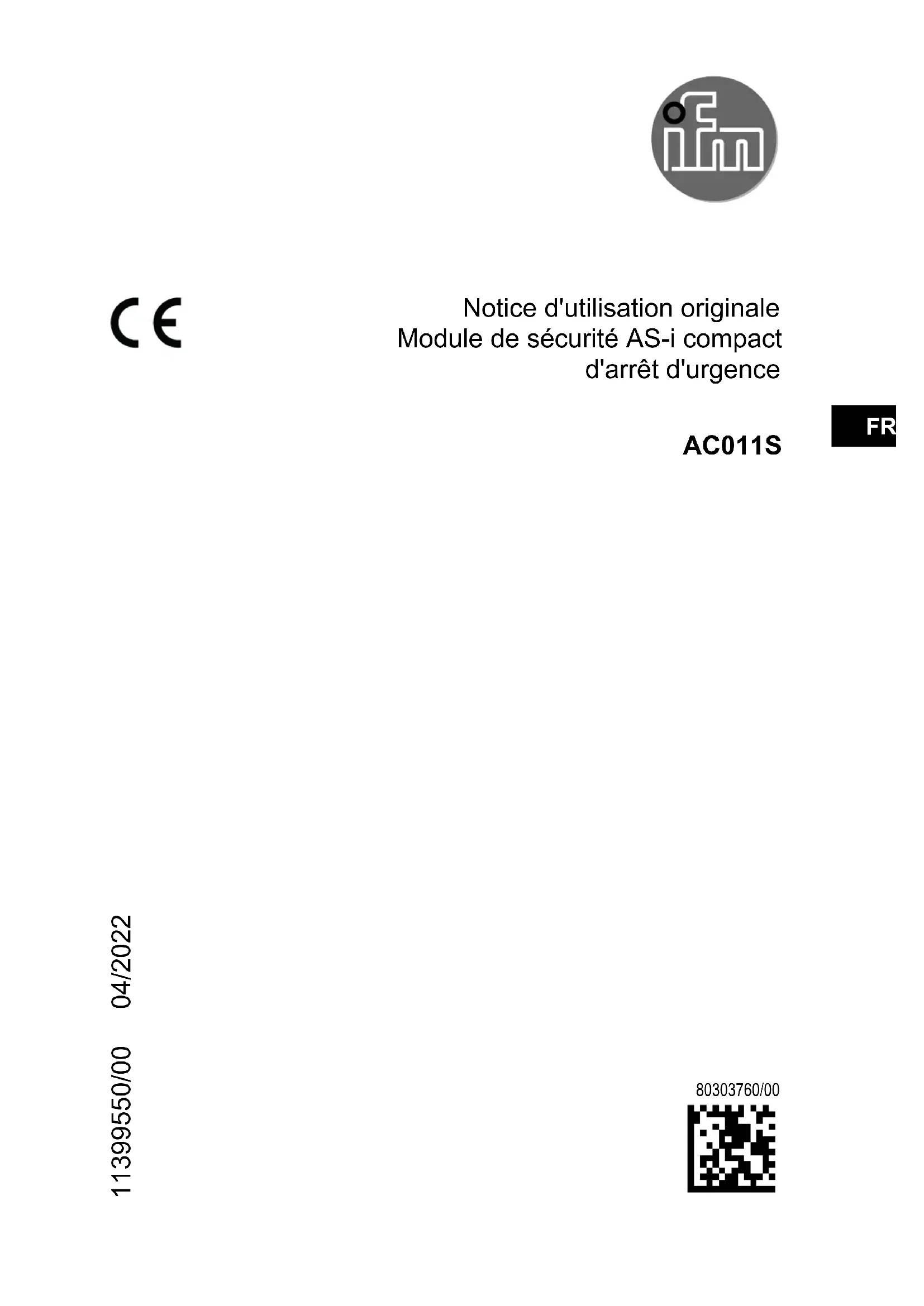 Notice d'utilisation originale Module de sécurité AS-i compact d'arrêt d'urgence AC011S FRFR 11399550/00 04/2022 80303760/002 Contenu 1 Remarque préliminaire 3 11 Explication des symboles 3 2 Consignes de sécurité 3 21 Exigences relatives à la sécurité de l'application 4 3 Limite de fourniture 4 4 Fonctionnement et caractéristiques 5 5 Description du fonctionnement et consignes de raccordement 5 6 Montage 6 61 Eléments de service et d'indication 6 7 Raccordement électrique 7 8 Adressage 8 9 Fonctionnement 8 91 Temps de réponse 9 10 Données caractéristiques de sécurité9 11 Données techniques 10 12 Schéma d'encombrement 11 13 Correction de défauts 12 14 Maintenance, réparation et élimination 12 15 Homologations / certificats123