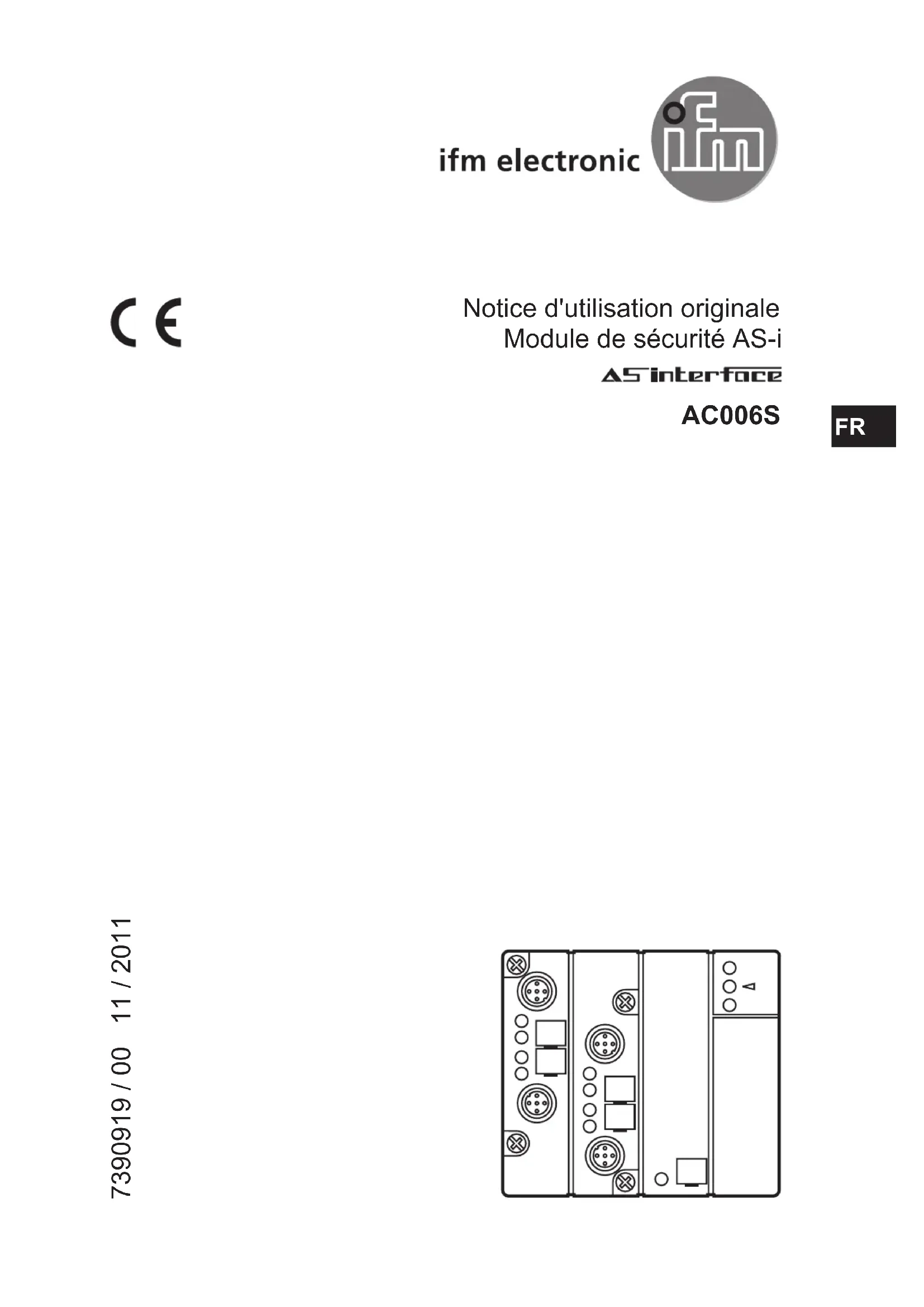 Notice d'utilisation originale Module de sécurité AS-i AC006S 7390919 / 00 11 / 2011 FR2 Contenu 1 Remarque préliminaire 3 11 Symboles utilisés 3 2 Consignes de sécurité 4 21 Exigences relatives à la sécurité de l'application 5 3 Fourniture 5 4 Fonctionnement et caractéristiques 5 5 Description du fonctionnement et consignes de raccordement 6 6 Montage 6 7 Raccordement électrique 7 8 Adressage 9 81 Adressage infrarouge 9 9 Fonctionnement 10 91 Bits de données 12 92 Temps de réponse 13 10 Schéma d'encombrement 13 11 Données techniques 14 111 Données caractéristiques de sécurité 15 12 Termes et abréviations 16 13 Correction de défauts 16 14 Maintenance, réparation et élimination 16 15 Normes 17 151 Homologations / certificats 173
