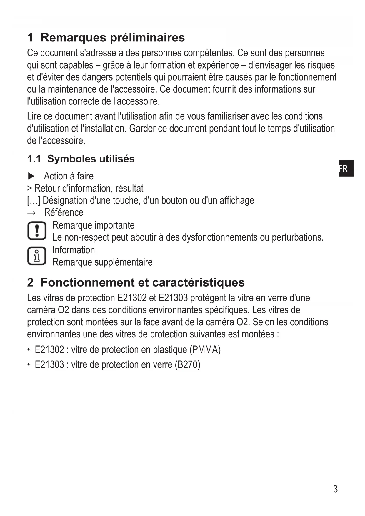 - Référence Remarque importante Le non-respect peut aboutir à des dysfonctionnements ou perturbations Information Remarque supplémentaire 2 Fonctionnement et caractéristiques Les vitres de protection E21302 et E21303 protègent la vitre en verre d'une caméra O2 dans des conditions environnantes spécifiques Les vitres de protection sont montées sur la face avant de la caméra O2 Selon les conditions environnantes une des vitres de protection suivantes est montées :