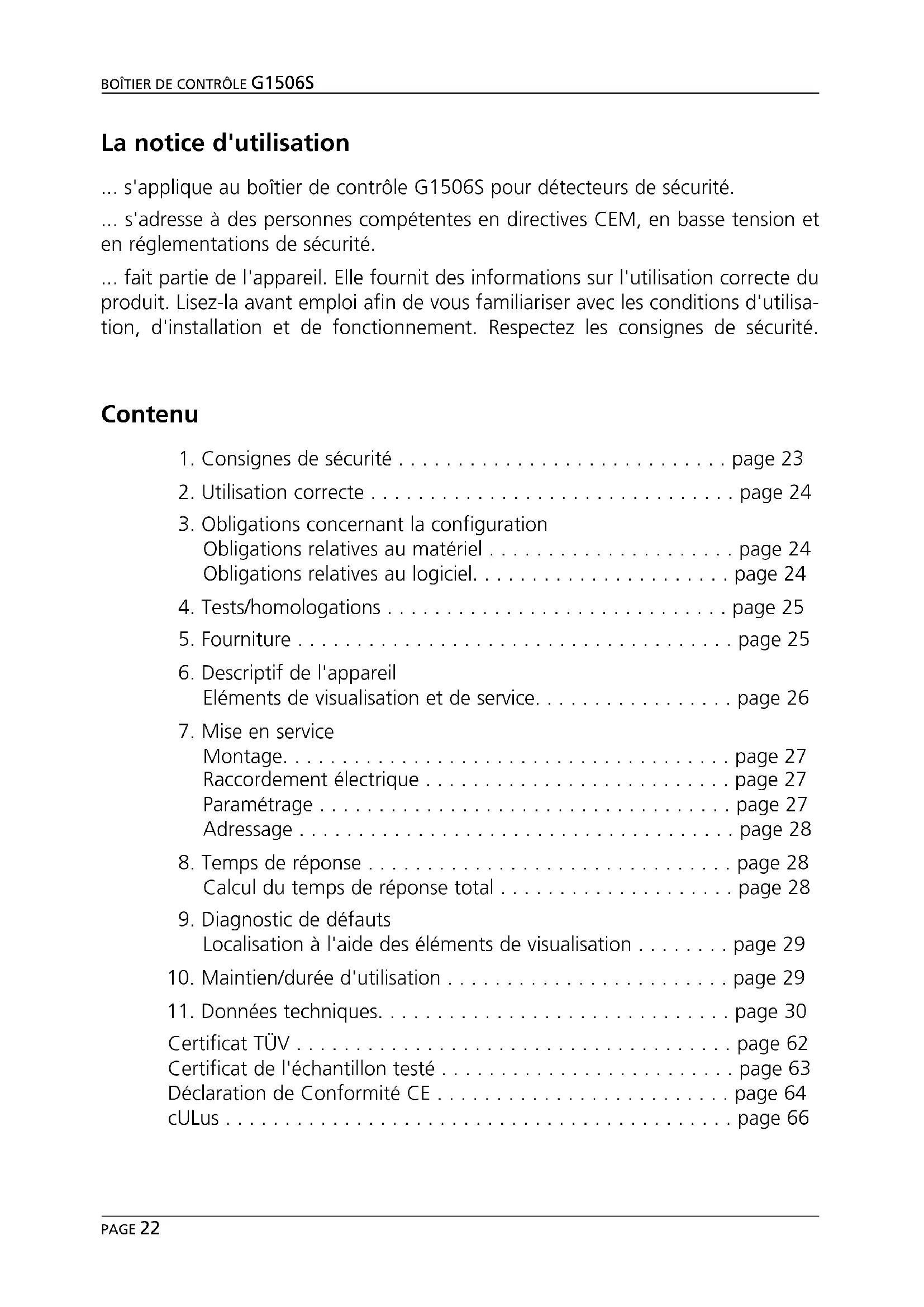 5La notice d'utilisation ... s'applique au boîtier de contrôle G1506S pour détecteurs de sécurité. ... s'adresse à des personnes compétentes en directives CEM, en basse tension et en réglementations de sécurité. ... fait partie de l'appareil. Elle fournit des informations sur l'utilisation correcte du produit. Lisez-la avant emploi afin de vous familiariser avec les conditions d'utilisa- tion, d'installation et de fonctionnement. Respectez les consignes de sécurité. Contenu