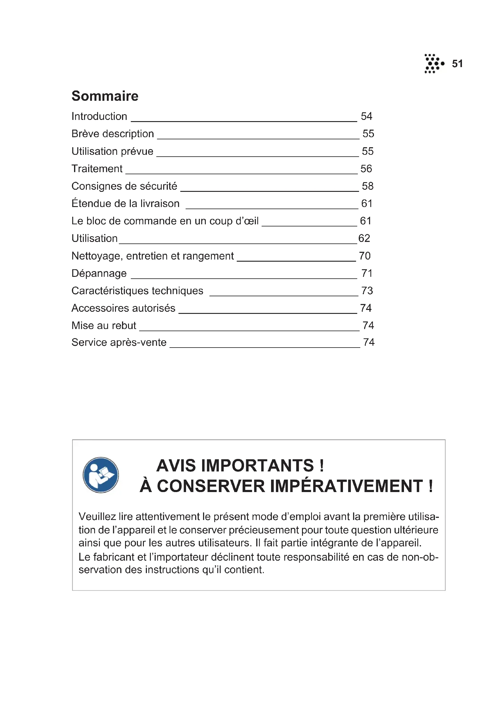est conçu pour un usage domestique. Cet article doit être utilisé uniquement tel qu’indiqué dans le présent mode d’emploi. Toute autre utilisation est considérée comme non conforme. Tout défaut imputable à une utilisation non-conforme, à une détérioration ou à des tentatives de réparation est exclu de la garantie. L’usure normale est également exclue de la garantie.56 Traitement Le est conçu de manière à pouvoir être utilisé sans connaissances ou aptitudes particulières.