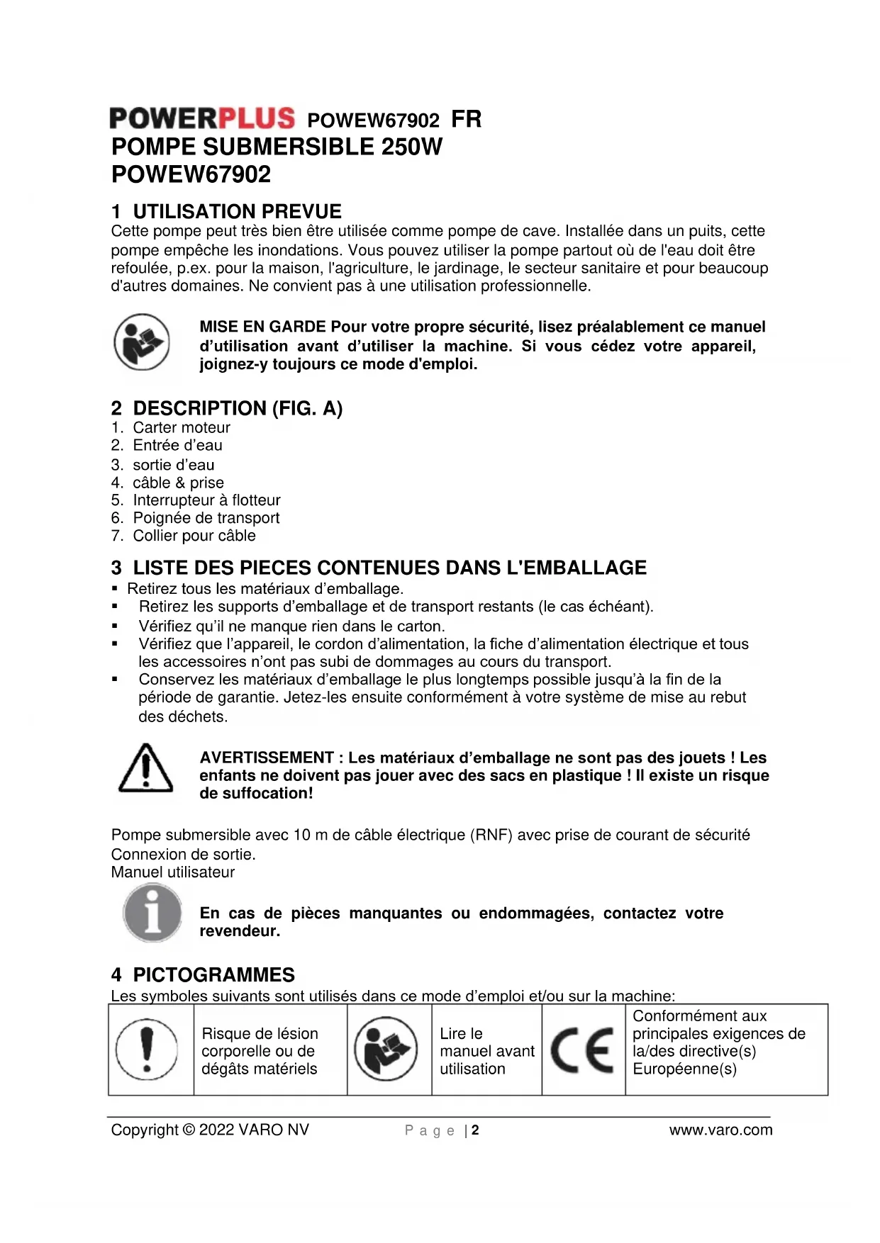 - En cas d'écart insuffisant, un fonctionnement irréprochable n'est pas garanti. En ce qui concerne le réglage, veillez à ce que l'interrupteur à flotteur ne touche pas le sol avant l'arrêt de la pompe. Attention! Risque de marche à sec. L'usage de cet appareil ne convient pas aux enfants et aux personnes dont les capacités physiques ou sensorielles sont diminuées ou aux personnes dépourvues d'expérience ou de connaissances, excepté si ces personnes bénéficient de la surveillance d'une personne responsable de leur sécurité ou si elles reçoivent des consignes préalables relatives à l'utilisation de l'appareil.POWEW67902 FR Copyright © 2022 VARO NV P a g e | 5 www.varo.com