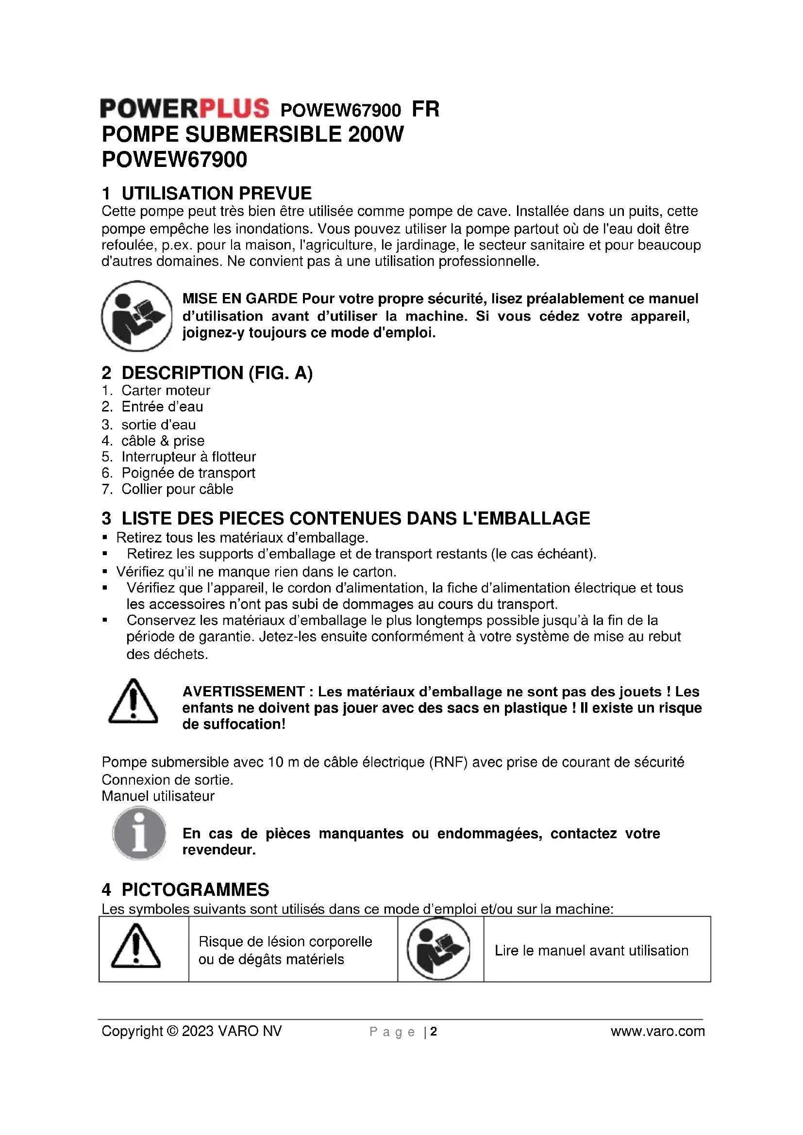 - En cas d'écart insuffisant, un fonctionnement irréprochable n'est pas garanti. En ce qui concerne le réglage, veillez à ce que l'interrupteur à flotteur ne touche pas le sol avant l'arrêt de la pompe. Attention! Risque de marche à sec. L'usage de cet appareil ne convient pas aux enfants et aux personnes dont les capacités physiques ou sensorielles sont diminuées ou aux personnes dépourvues d'expérience ou de connaissances, excepté si ces personnes bénéficient de la surveillance d'une personne responsable de leur sécurité ou si elles reçoivent des consignes préalables relatives à l'utilisation de l'appareil.POWEW67900 FR Copyright © 2023 VARO NV P a g e | 5 www.varo.com