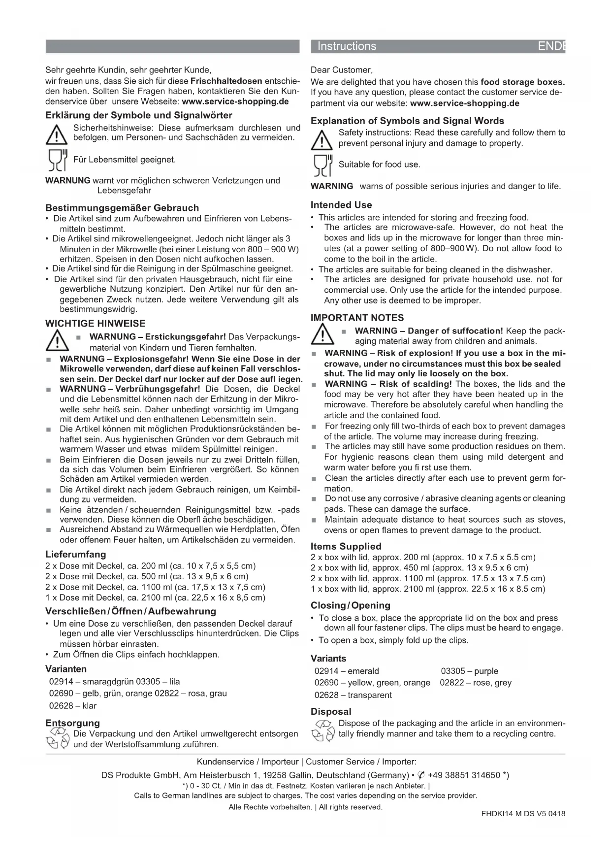 - To open a box, simply fold up the clips. Variants 02914 – emerald 03305 – purple 02690 – yellow, green, orange 02822 – rose, grey 02628 – transparent Disposal Dispose of the packaging and the article in an environmen- tally friendly manner and take them to a recycling centre. FHDKI14 M DS V5 0418Handleiding NLFR Mode d'emploi Service après-vente / importateur | Klantenservice / importeur: DS Produkte GmbH, Am Heisterbusch 1, 19258 Gallin, Deutschland (Allemagne | Duitsland) • ✆ +49 38851 314650 *) *) Prix d‘un appel vers le réseau fi xe allemand. Coût variable selon le prestataire. | Niet gratis voor Duitse vaste lijnen. Kosten variëren per aanbieder. Tous droits réservés. | Alle rechten voorbehouden. Chère cliente, cher client, Nous nous réjouissons que vous ayez décidé d’acheter ces boîtes fraîcheur. Pour toutes questions, veuillez contacter le service après-vente sur notre page Web : www.service-shopping.de Explication des symboles utilisés et es mentions d’avertissement Consignes de sécurité : lisez et observez attentivement les consignes de sécurité afi n de prévenir tout dommage cor- porel ou matériel. Pour usage alimentaire. AVERTISSEMENT Vous avertit d’un risque potentiel de bles- sures graves et mortelles. Utilisation conforme