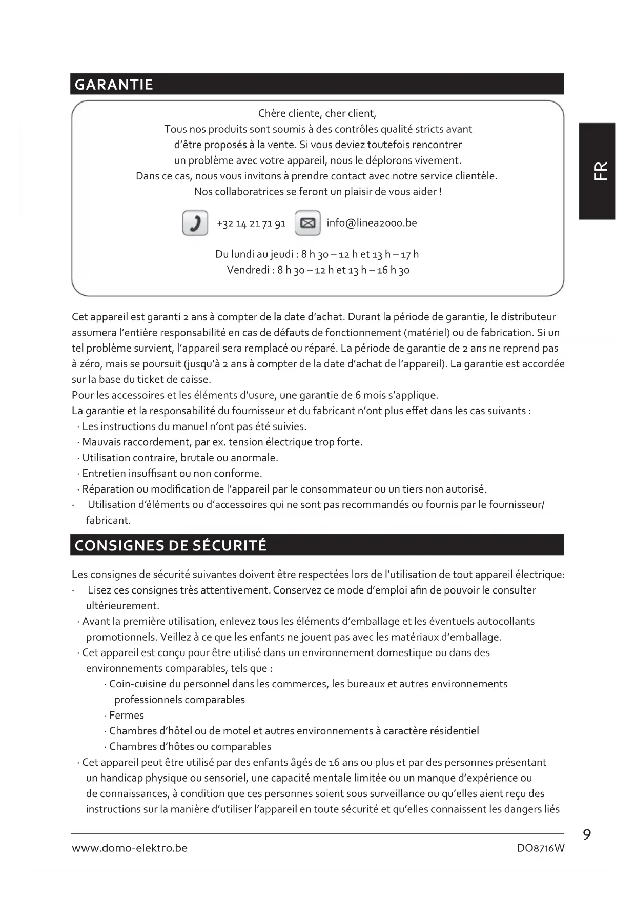 GARANTIE Chère cliente, cher client, Tous nos produits sont soumis à des contrôles qualité stricts avant d’être proposés à la vente. Si vous deviez toutefois rencontrer un problème avec votre appareil, nous le déplorons vivement. Dans ce cas, nous vous invitons à prendre contact avec notre service clientèle. Nos collaboratrices se feront un plaisir de vous aider ! +32 14 21 71 91 info@linea2000.be Du lundi au jeudi : 8 h 30 – 12 h et 13 h – 17 h Vendredi : 8 h 30 – 12 h et 13 h – 16 h 30 Cet appareil est garanti 2 ans à compter de la date d’achat. Durant la période de garantie, le distributeur assumera l’entière responsabilité en cas de défauts de fonctionnement (matériel) ou de fabrication. Si un tel problème survient, l’appareil sera remplacé ou réparé. La période de garantie de 2 ans ne reprend pas à zéro, mais se poursuit (jusqu’à 2 ans à compter de la date d’achat de l’appareil). La garantie est accordée sur la base du ticket de caisse. Pour les accessoires et les éléments d’usure, une garantie de 6 mois s’applique. La garantie et la responsabilité du fournisseur et du fabricant n’ont plus eet dans les cas suivants :