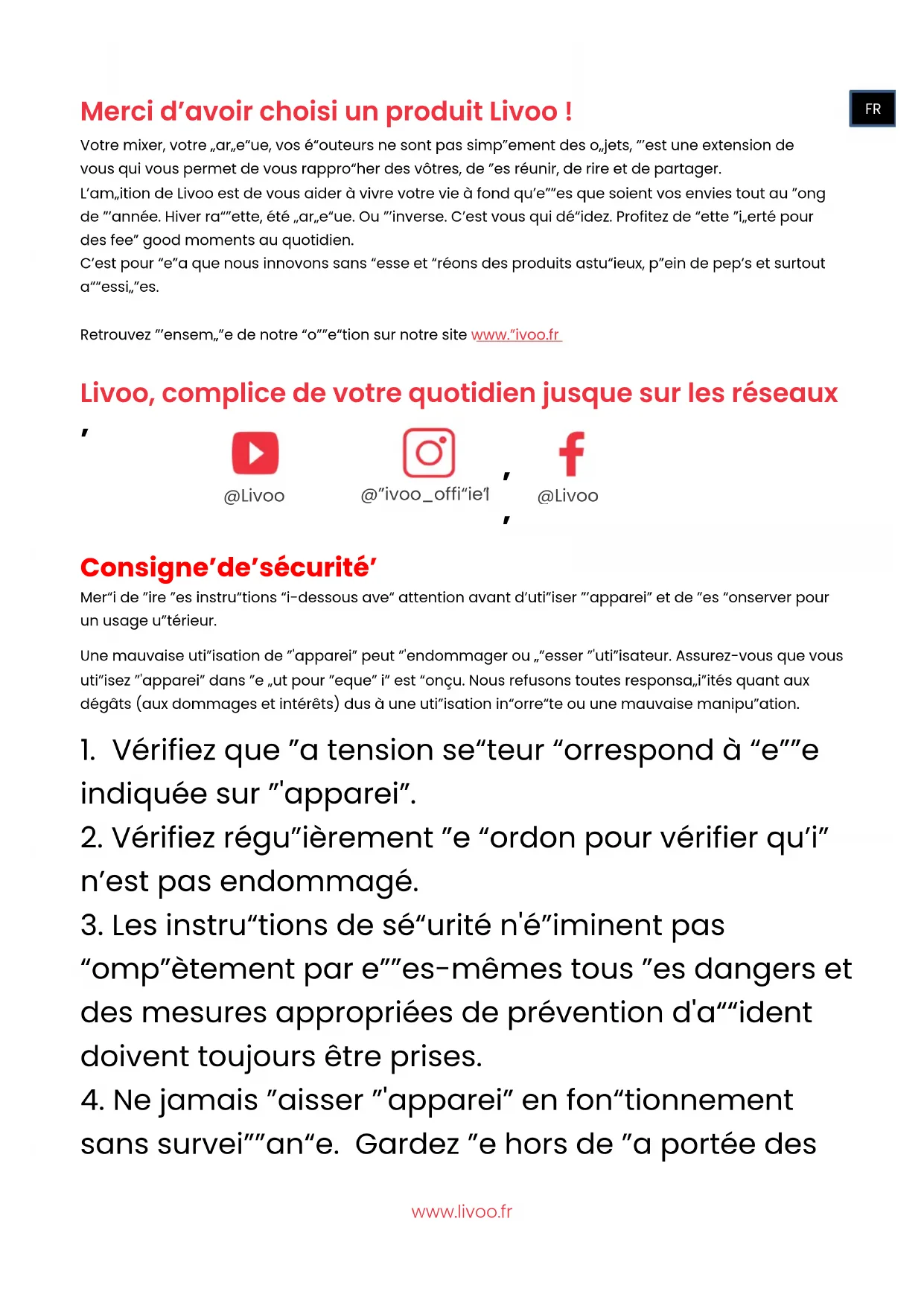 Figure 1www.livoo.fr Merci d’avoir choisi un produit Livoo ! Votre mixer, votre barbecue, vos écouteurs ne sont pas simplement des objets, c’est une extension de vous qui vous permet de vous rapprocher des vôtres, de les réunir, de rire et de partager. L’ambition de Livoo est de vous aider à vivre votre vie à fond qu’elles que soient vos envies tout au long de l’année. Hiver raclette, été barbecue. Ou l’inverse. C’est vous qui décidez. Profitez de cette liberté pour des feel good moments au quotidien. C’est pour cela que nous innovons sans cesse et créons des produits astucieux, plein de pep’s et surtout accessibles. Retrouvez l’ensemble de notre collection sur notre site www.livoo.fr Livoo, complice de votre quotidien jusque sur les réseaux