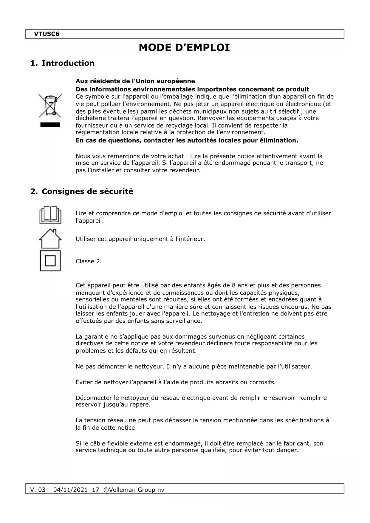 N’employer cet appareil qu’avec des accessoires d’origine. La Velleman Group nv ne peut, dans la mesure conforme au droit applicable être tenue responsable des dommages ou lésions (directs ou indirects) pouvant résulter de l’utilisation de cet appareil. Pour plus d’information concernant cet article et la dernière version de cette notice, visiter notre site web www.velleman.eu. Toutes les informations présentées dans cette notice peuvent être modifiées sans notification préalable.