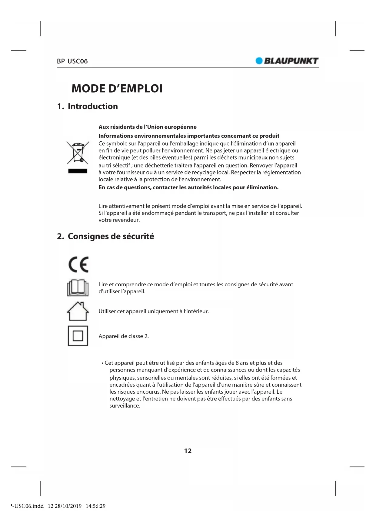- Cet appareil peut être utilisé par des enfants âgés de 8 ans et plus et des personnes manquant d’expérience et de connaissances ou dont les capacités physiques, sensorielles ou mentales sont réduites, si elles ont été formées et encadrées quant à l’utilisation de l’appareil d’une manière sûre et connaissent les risques encourus. Ne pas laisser les enfants jouer avec l’appareil. Le nettoyage et l’entretien ne doivent pas être eectués par des enfants sans surveillance. BP-USC06.indd 12 28/10/2019 14:56:29BP-USC06